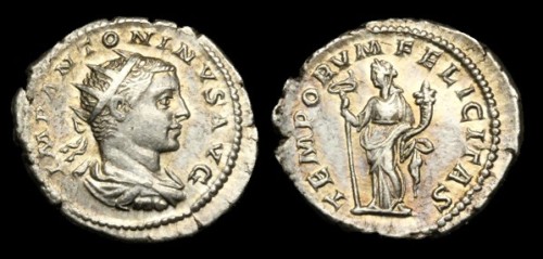 My Favorite Elagabalus Antoninianii Nice one's Randy, and everyone else! ikandiggit I really like that type of Gordian Antoninianus, the SAECULI FELICITAS from the Antioch mint, I have one myself, your reverse looks a bit nicer than mine. Also a very nice one of Postumus, great reverse detail.... I don't have any coins of him. Doug as you know, I just love your Caracalla Ant, that is the bust type I still don't have, beautiful reverse as well, great coin. I also am envious of your Philip I VICTORIA CARPICA Ant, sounds like you did well with that one if the dealer didn't know how rare it is. Lucky one! Mat That Otacilia Severa ant is still one of the nicest style examples I have seen, and I really like that Gallienus..... I mean a Gallienus over 5 grams, pretty cool, looks like good silver too. I have a Gallienus, with good silver that weighs 5.1 grams.... I thought yours weighed more... like 5.4 grams or so...... either way, both yours and mine are the heaviest Gallienus coins I have seen. I have quite a few Antoninianii, and have trouble narrowing down a 'best' one.... but when it comes to one of my favorite Emperors to collect Antoninianii from(Elagabalus), these two are my 'best' and my favorite.... I just love the beautifully done boyish portrait of this young Emperor. I like Elagabalus Antoninianii because I find the workmanship to be exsquisite on some, and I like that they are some of the earliest Antoninianii.... I also have several of Caracalla, the first to introduce the 'Antoninianus' as we call it today, after him. I also like the fact that during the reign of Elagabalus, the Antoninianii were still pretty heavy and fairly good silver, as well as being struck on large flans. So here are my 'best' Elagabalus Antoninianii.... the Roma seated reverse is my favorite, I just love the portrait...... the TEMPORUM FELICITAS is also quite a beautiful young portrait, and has some really pretty toning.