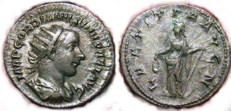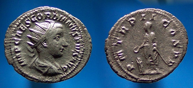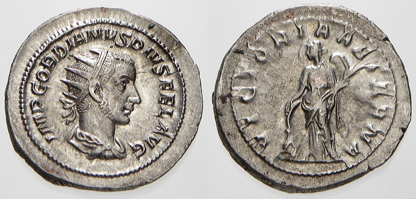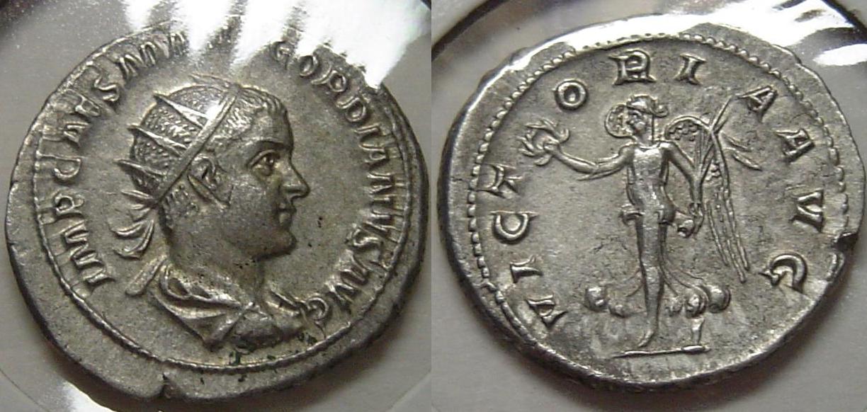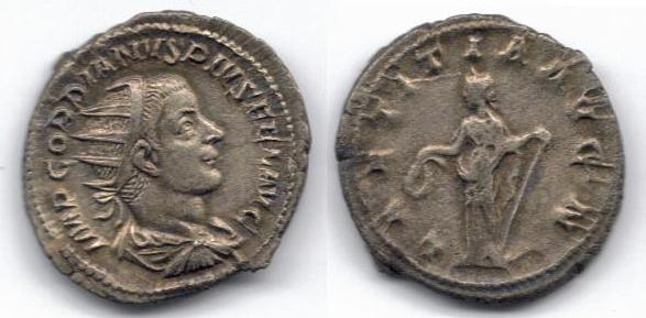 I've always really liked this one Gordian III ant: Gordian III AD 238-244 AR Antoninianus Rome mint RIC 86, RSC 121, Sear5 8617 O: IMP GORDIANVS PIVS FEL AVG, Radiate bust right, draped and cuirassed R: LAETITIA AVG N, Laetitia standing right with wreath & anchor