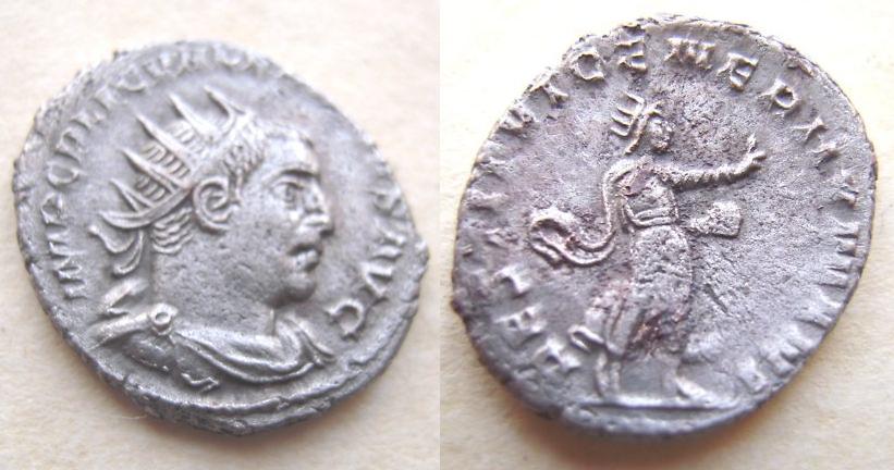 I own many but I think these are my best 3. Gallienus (253 - 268 A.D.) AR Antoninianus O:IMP C P LIC GALLIENVS AVG Radiate and cuirassed bust right R:IOVI CONSERVA Jupiter standing left, head turned right, holding scepter in right and thunderbolt in left. 5.1g Trajan Decius July (249 - 251 A.D.) Silver Antoninianus O: IMP C M Q TRAIANVS DECIVS AVG, radiate and cuirassed bust right. R: VICTORIA AVG, Victory advancing left, wreath in right, palm frond in left. SRCV III 9387, RIC IV 29c, RSC IV 113a 3.243g 22.3mm Otacilia Severa Silver antoninianus, SRCV III 9149, RIC IV 126, RSC IV 17, EF, weight 3.7 g, maximum diameter 23.9 mm, die axis 180o, Rome mint, 247 A.D. Obverse M OTACIL SEVERA AVG, diademed and draped bust right set on crescent. Reverse CONCORDIA AVGG, Concordia seated left, patera in right, cornucopia in left, altar at feet.