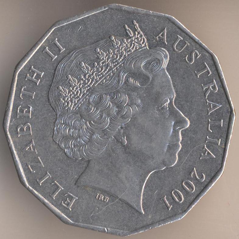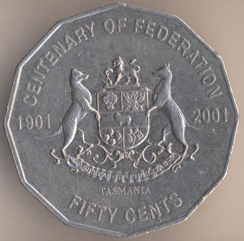 50 cents 2001, copper-nickel, weight - 15,55 g., size - 31,5 mm, thickness - 3 mm, mintage - 43149600 pcs. Engraver: Ian Rank-Broadley. "100th Anniversary of Federation - Australia". Single release.