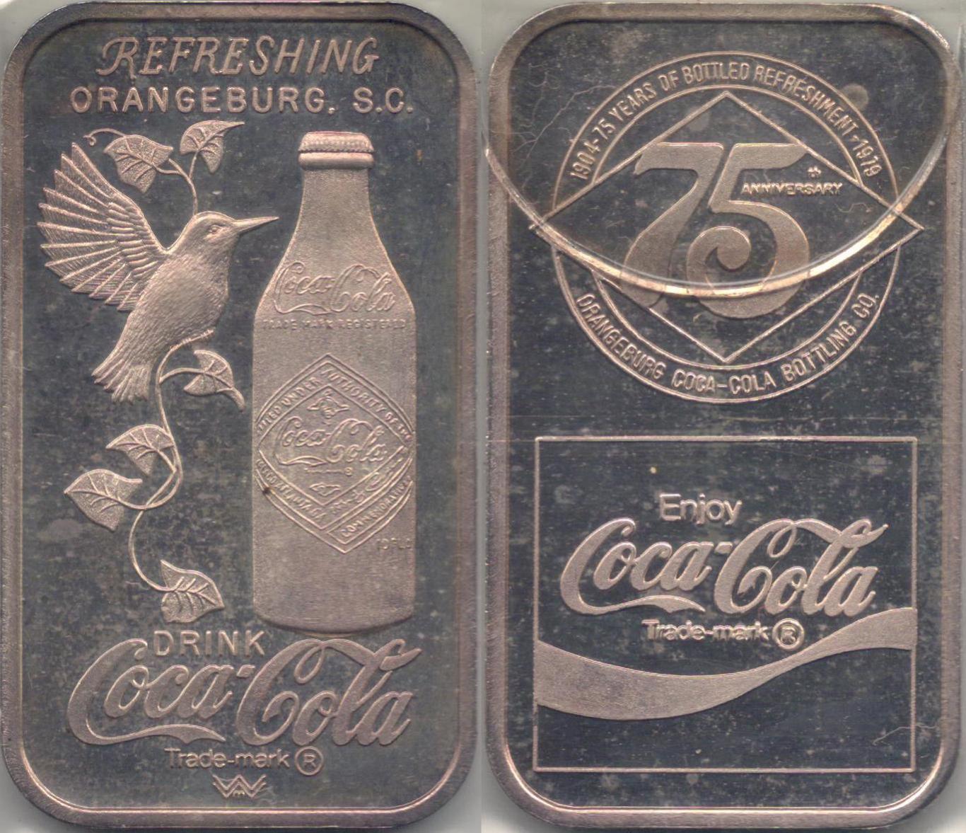 A Dansco album is a good album to put Coca-Cola silver art bars in them. I would recommend the Dansco silver art bar album that will show case the Coca-Cola silver art bars in a vertical fashion (like in your picture). The Dansco album that you should look for is Dansco album # 7086. There is also a red album that is specifically made for holding Coca-Cola silver art bars but they are hard to find on ebay. The Dansco album # 7086 is your best bet IMO to showcase your Coca-Cola bars. That Orangeburg, S.C. Coca-Cola silver art bar was minted by the World Wide Mint in 1979. There are two types of this particular Orangeburg, S.C silver art bar that was minted in 1979. The first type was a regular 1-oz .999 silver bar. The second type was a "silver-filled" art bar. According to the second edition of Thomas Mock's book titled "Coca-Cola Bottler's 75th Anniversary Ingot and Guide Book 1975 to 1988", the silver filled ingots had a copper middle layer that was covered in silver. Thomas Mock's Coca-Cola guide book also mentioned that there were a total of 11 different "silver-filled" Coca-Cola bars that The World Wide Mint minted and the reason for the creation of the "silver-filled" bars was to control its costs since the silver price spiked up in 1979-1980. The "silver-filled" ingot is NOT a .999 pure silver art bar. Besides weighing it, There is a way you can tell if that Orangeburg Coca-Cola bar is either .999 silver or "silver-filled". The weight and purity of each of the Coca-Cola silver art bars is stamped on the side of the bar. If it is .999 silver, then it will say "One Troy OZ .999 Fine Silver" on the side. If it is a "silver-filled" Coca-Cola bar, then I believe that it will say something like "Sterling" on the side of the bar but I am not 100% sure on that. Also according to Thomas Mock's Coca-Cola guidebook, The "silver-filled" version of the Orangeburg Coca-Cola bar has an value of $500 and an unknown mintage and the .999 pure silver version of the Orangeburg Coca-Cola bar has a value of $100 with a mintage of 1,200. With that said, most Coca-Cola silver art bars will not sell for guidebook price on ebay. The "silver-filled" version of the Orangeburg Coca-Cola bar is very hard to find anywhere locally or online. Based on my observations of watching ebay auctions on Coca-Cola bars, I have not seen the "silver-filled" version of the Orangeburg Coca-Cola art bar on ebay. Also, I have never seen the .999 pure silver version of the Orangeburg Coca-Cola bar sell on ebay. I suspect that both the .999 pure silver and the "silver-filled" versions will probably have sell for a lot of money on ebay since apparently it is a hard-to-find Coca-Cola art bar. I also collect Coca-Cola bars and those Coca-Cola bars are one of my favorite types of silver art bars to collect.