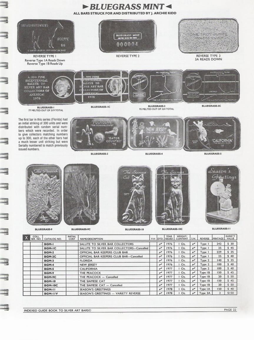 Hi Heddenlaw, I've attached the page from Archie Kidd's 'An indexed guidebook of Silver Art Bars Vol V' concerning the Bleugrass Mint. This Mint was owned by Archie Kidd Himself, and he issued these bars. Your 'Siamese Cat' had an ultra low mintage of 150 bars ! Hope this helps.