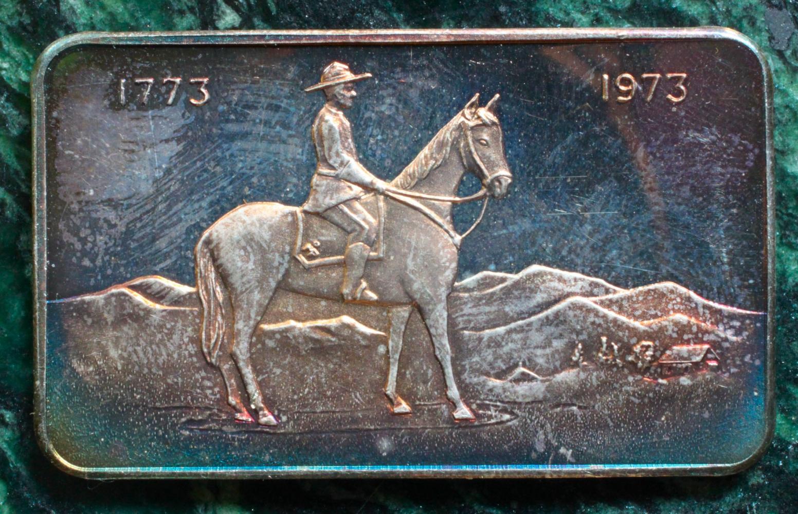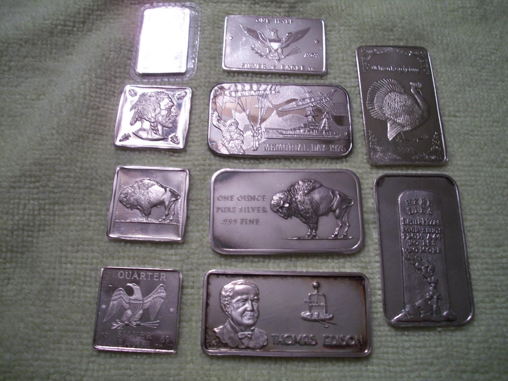 The bright light is actually a 5 gram Johnson Matthey bar. The top bar is a 1/2 ounce "silver eagle" from Walla Walla. The Thanksgiving 73 is unmarked as far as weight & purity, and is from the Columbus mint. (only paid $5 for it) Three 1/4 ounce squares. A United States Silver Corporation Memorial Day 1975 bar that has two paratroopers, a plane and a ship on it. A bi-centennial Buffalo bar. A tombstone bar that reads "Here Lies Lester Moore, four slugs from a 44, No Les No More," with the reverse reading "Tombstone Arizona, the town too tuff to die." And lastly a Hamilton mint bar from the "Our Greatest Americans" series of Thomas Edison.
