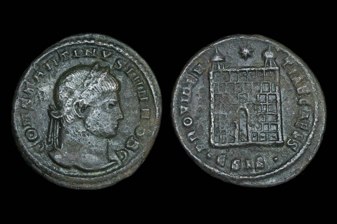 I think it is this one: Siscia RIC VII 200,B Constantine AE follis. 326-327 AD. CONSTANTINVS AVG, Laureate head right / PROVIDENTIAE AVGG, Campgate with six rows, two turrets, no doors, star above, top and bottom row blocks. Mintmark dot BSIS dot. http://wildwinds.com/coins/ric/constantine/_siscia_RIC_vII_200,B.jpg