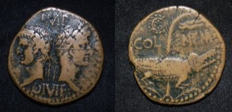 A decent example, especially for the price. I'm currently after a specimen of quite a good style that I will show should I win the battle My halved example : Augustus & Agrippa, AE halved dupondius struck in Nemausus, after 10 BC 3rd type [IM]P [DI]VI F , Laureate head of Augustus right [COL NEM], Crocodile chained to palm tree 6.70 gr Ref : RCV #1730, Cohen # 10 Q