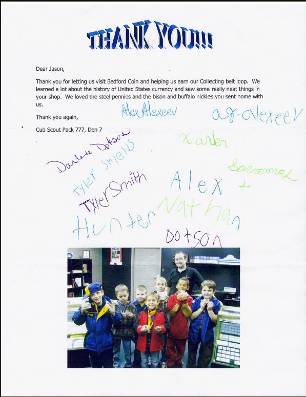 While I'm not sure any will become YN's they sure did have a good time while in the shop. It was a fun experiance for them & myself . I had not had the pleasure of having so many fingers on my cases & questions being thrown at me at what seemed to the same time before . The pack of scouts visited my shop after hours one evening last December. I had an hour or so with them , (& few of their non scout siblings & the parents) & got to go over some of the simple things about the hobby & my profession. Luckly I was prepared & had an outline of what they needed to "know" to earn their loop. The hardest part for me was finding (10) matching SWAG items. Each child got a proof cent, a set of the (4) 2009 Presidential cents,a steel cent , BU 2005 Bison nickel,an Indian head cent & finally they all got to dig through the Buffalo Nickle bin & pick out their own coins. Like I said it was fun & I would do it again for them in a heartbeat ,especially after seeing their faces when they got to dig into the Buff's.