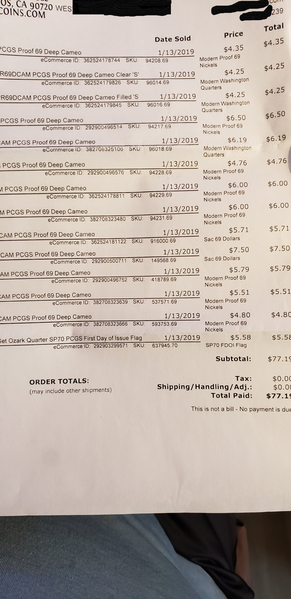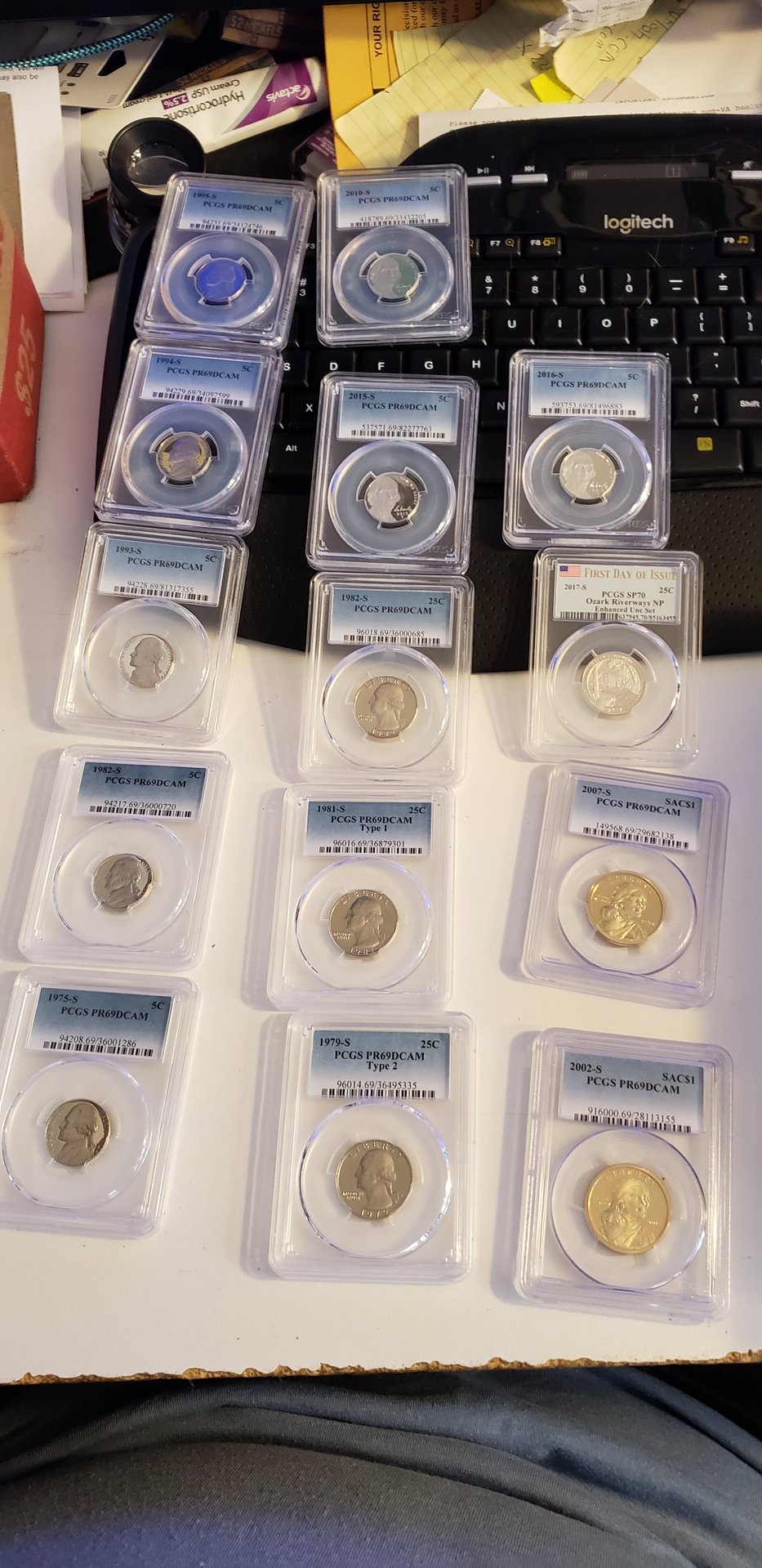 Well, my budget is an "allowance." I know, 54 years old and stuck on an allowance lol. It works well as I am not the smartest with money all the time so my wonderful wife handles that part of life. As I mentioned in an earlier post about the getting carried away. Here is a picture of the coins I purchased, the price list, and they sent me a PCGS slab holder for free - my very first one. A total of 14 coins all but 1 PR69 one is a 70 (not sure that really matters). 8 nickels, 4 quarters 1 of which is an America the Beautiful, and 2 Sacagawea (yes I had to look the spelling up ) dollars. I am not sure if I can list the seller or not. If I can let me know and I will. I got the coins in just 3 days. I am really happy and will be playing with my "lighted 10X" magnifying glass for a while tonight haha. Brad
