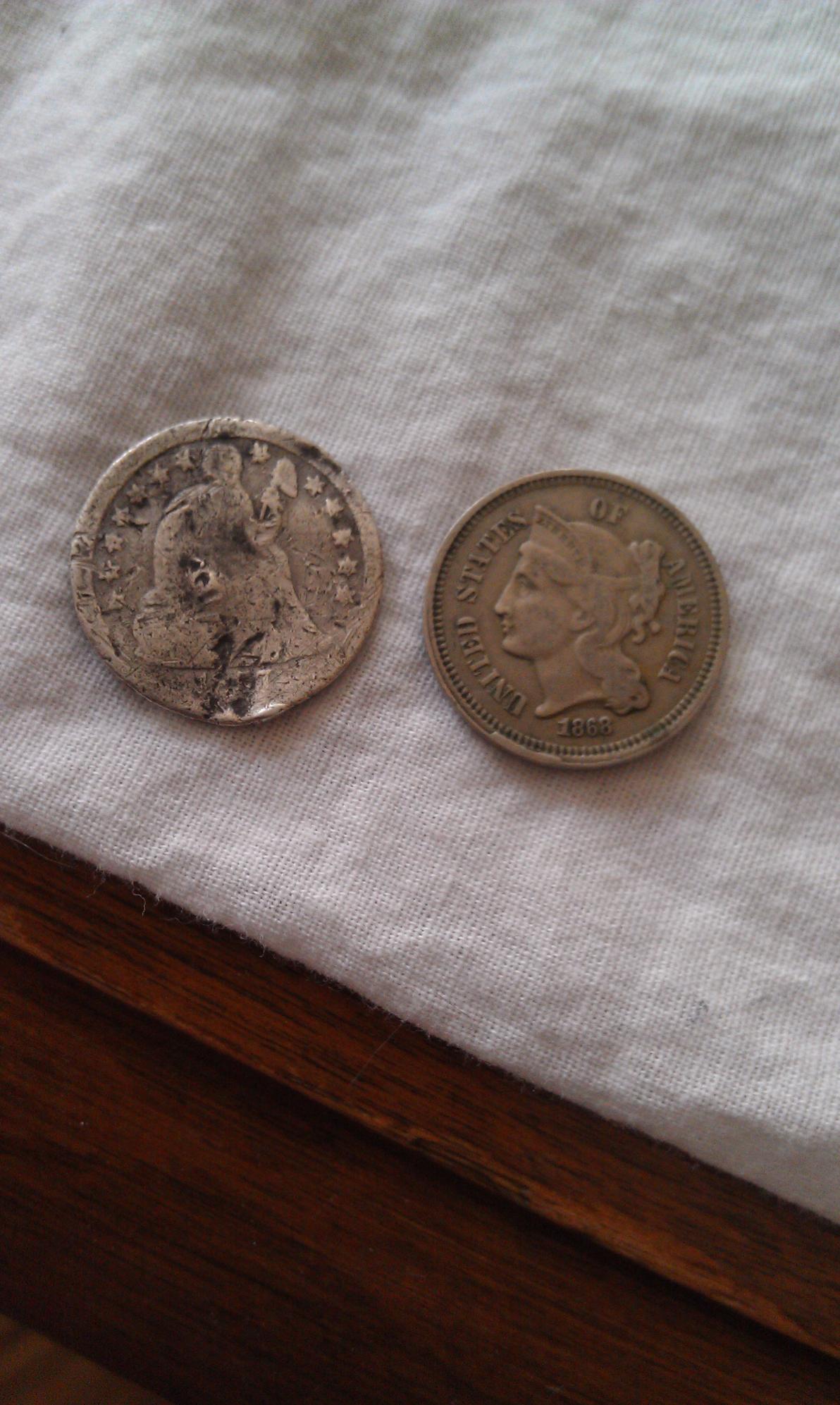 Oh, and here's a picture of the 3-Cent Piece next to a damaged sitting liberty dime, which I believe is an 1857 based on (1) the star pattern and (2) the last digit being "7."