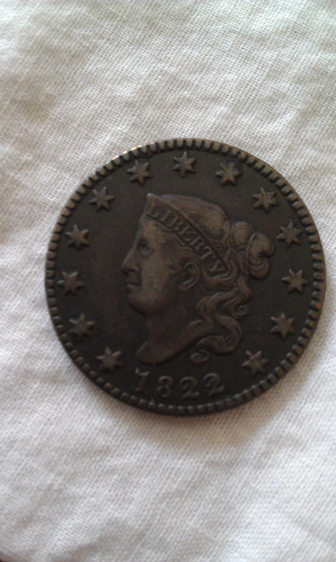 The best part was the "collection" my mother-in-law's grandfather had that ended up in the can. He had several worn-but-readable large size silver certificates from Series 1923, a couple of civil war era sitting liberty dimes and quarters, an 1868 nickel 3-Cent Piece, AND (wait for it) a beautiful 1822 large cent!