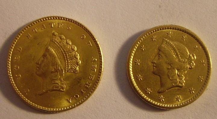 1) 1854 Type 2 Indian Princess head gold dollar. She looks Low UNC or high AU (you guys tell me). Nice luster remaining, there were notoriously struck weak (from what I have read and researched), and I think this is an example as shown with the "8" in the date.