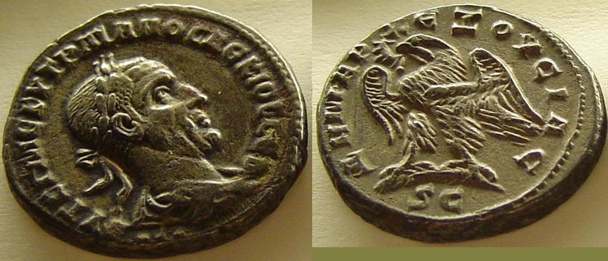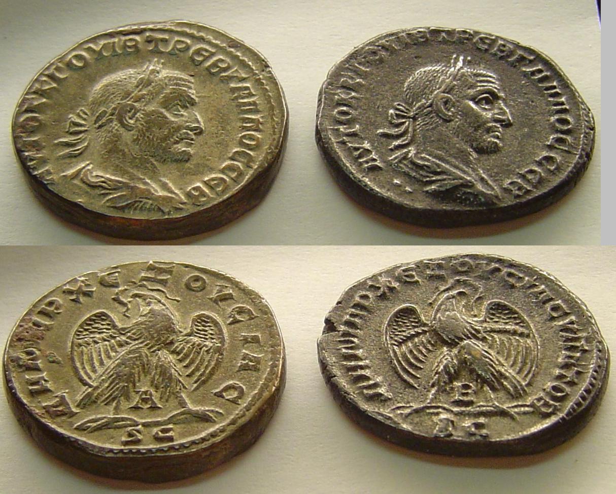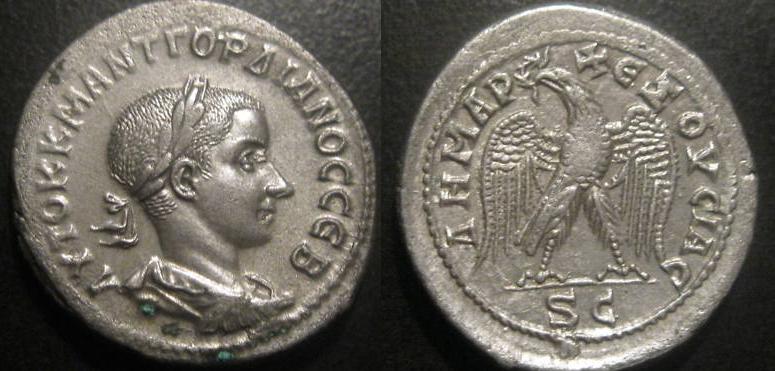 Eagles I didn't know that medoraman, very interesting. I agree about history and little bits of metal Thanks, yeah I always liked the style of eagle that Trebonianus Gallus tetradrachmai used, here are some examples of other eagle varieties from other emperors from Antioch. This first one is one of the most beautiful eagle designs I have ever seen, it is a Gordian III tetradrachm from AD 240. Such a nice style of eagle, I have seen few of this type so nice. Alot of the Philips Tetradrachmai use a similar eagle, aside from some of the early issues and some others. This second one is of an interesting styled eagle, on a frontal bust left, cuirassed tetradrachm of Philip I, dated to year 3 of his reign. Decius tetradrachmai also have a very nice eagle, this third and fourth picture is of one of my nicest reverses of Emperor Decius.