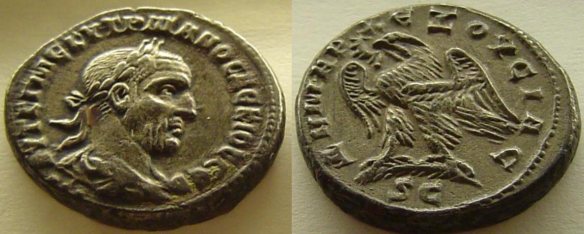 Tetradrachm, Philip I - Cuirassed, Medusa head breastplate P.S.: I got the coins shown above weighed. The weight of the Caracalla Antoninianus with the reverse of Venus holding a helmet with two captives at her feet is 5.5 grams. The weight of the frontal bust Caracalla Antoninianus with Venus on the reverse holding Victory and no captives is 5.2 grams. And the Gallienus 'GERMANICUS MAX V' Antoninianus weighs 5.1 grams. --------------------------------------------------------------------------- New Tetradrachm I didn't want to have to start a new thread... hopefull everyone interested will see this here.... I just got this Tetradrachm, I was wondering what you all think? I'm pretty sure it's authentic, everything seems right, the metal visible on the edge just looks smoother than most I've seen.... what do you think? Philip I AR Tetradrachm of Antioch, Syria. Dated Year 3 = 248 AD. 11.4 grams. obv: - Laureate, cuirassed bust left, breastplate decorated with a gorgoneion (head of Medusa). rev: eagle standing facing left with wings spread, head left with wreath in its beak. SC below. *the second obverse picture is a bit off color due to my camera.* The first photo represents the obverse the best. The reverse does have a little bit of a bronze-y look to it though,
