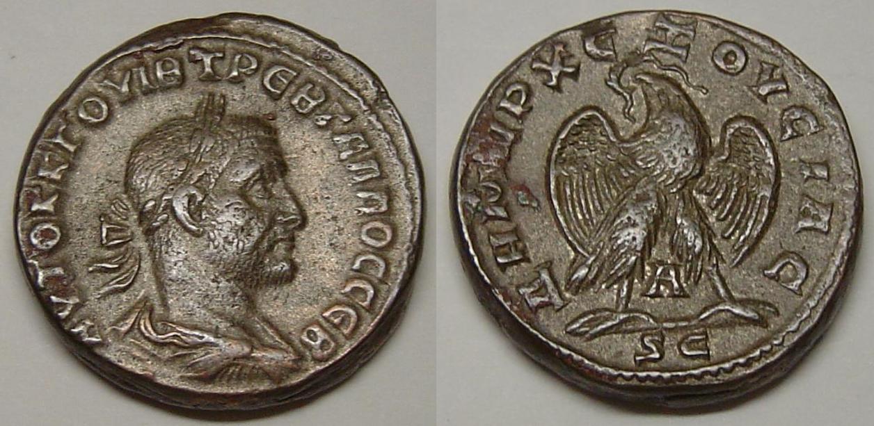 New Trebonianus Gallus Tetradrachm - Officina 1 - 13.5grams Well I talked to the seller and found out he guarantees it for life, and that he bought it from 'Silenos' a well know ebay dealer years ago. and here's my newest Trebonianus Gallus AD 251 - 253 Antioch, Tetradrachm obv:: AVTOK K G OVIB TPEB GALLOC CEB - Laureate bust right, draped and cuirassed. Seen from behind. One dot below bust. rev:: DHMAPX EZOVCIAC, eagle standing facing right, head left, tail left. (Officina 1) between legs. SC below. 13.5 grams. heavy. Now I have one of this Emperor from Officina A, B and C. Only one, the darkly toned one, has a consulship number on the reverse.