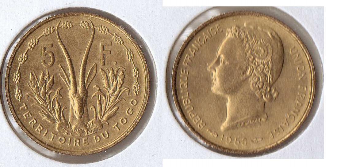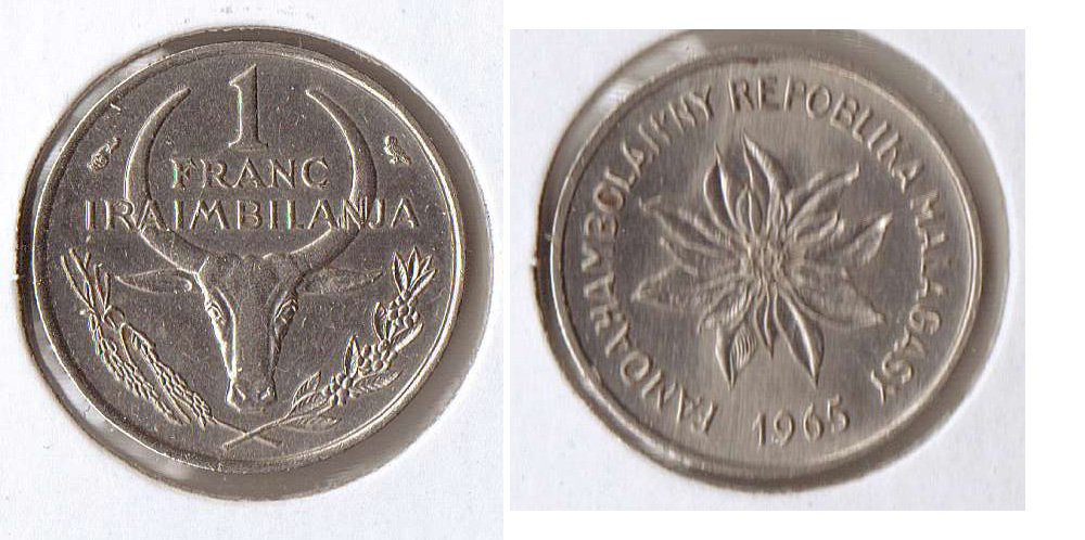 1964 Rhodesia 20 cents 1965 Congo 10 francs (I love this one. I actually got two of these). 1965 Malagasy 1 franc