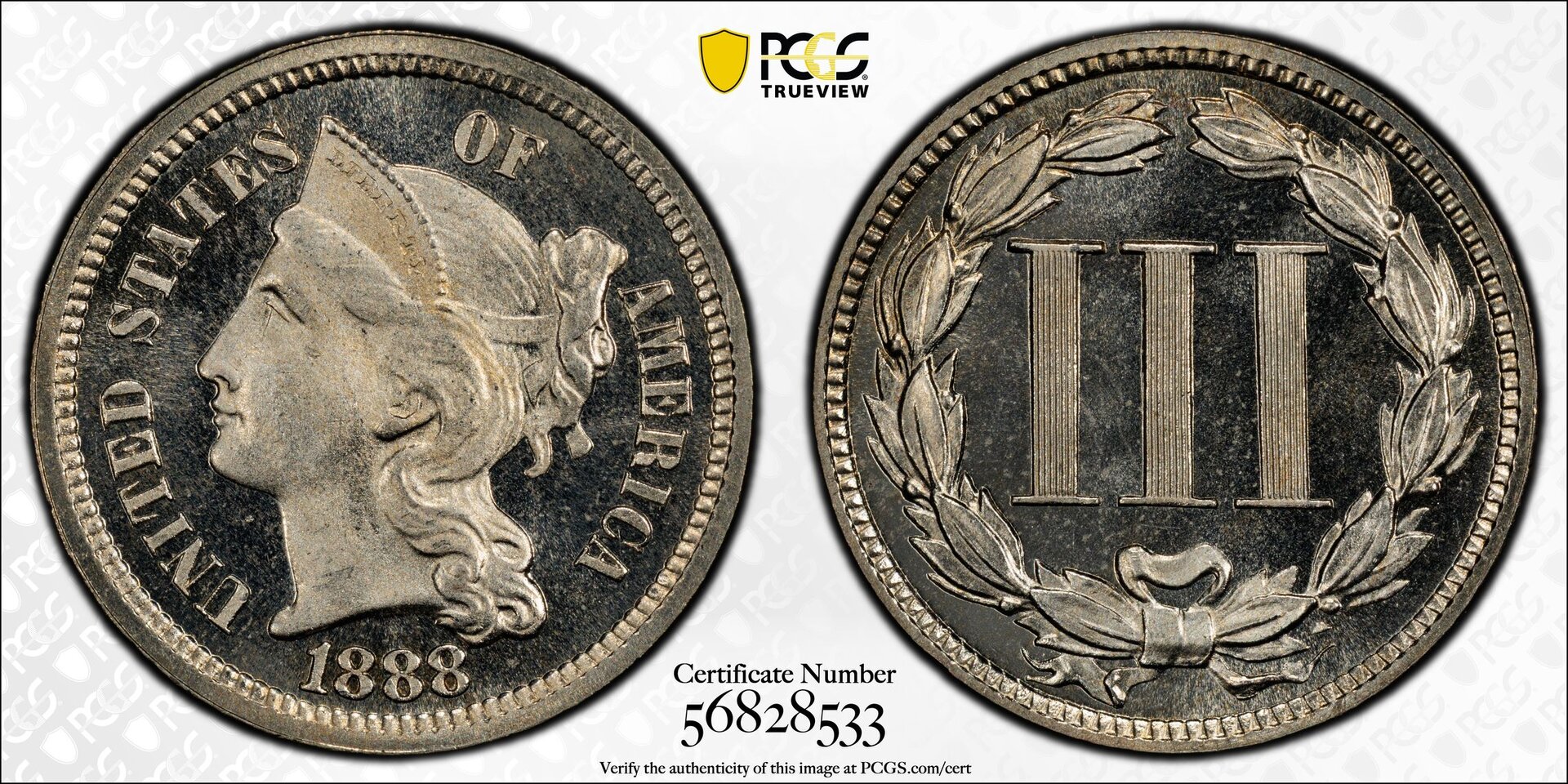 This is the coin I'll be getting. It is an 1888 USA nickel 3-cent piece, PCGS PR66 CAM (CAC).