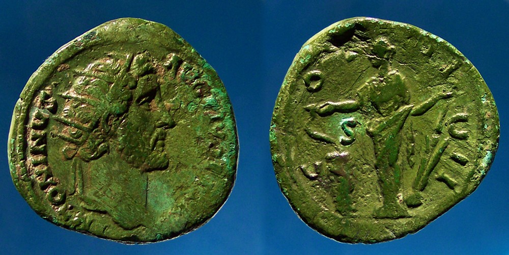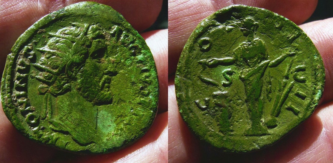 With hesitation, here's #6. The patina on this on looks amazing in hand and took a long to time to get a decent photo of it. Its a nice glossy lime/emerald green with a small amount of dirt still intact. Some of the patina had been chipped (perhaps while in the ground of when it was cleaned) but its still mostly intact. It has a great portrait too. Antoninus Pius AE Dupondius. ANTONINVS AVG PIVS P P TR P, radiate head right / COS IIII S-C, Salus standing left feeding snake arising from altar to left & holding rudder to right. Cohen 279 B.M.C. 1732 RIC 798, sear5 #4269 26mm 139 A.D. In 139A.D. "The Tomb of Hadrian in Rome is completed, emperor Antoninus Pius cremates the body of Hadrian and placed his ashes together with that of his wife Vibia Sabina and his adopted son, Lucius Aelius in the mausoleum. Marcus Aurelius is named Caesar. He marries Faustina the Younger, daughter of Antoninus Pius."