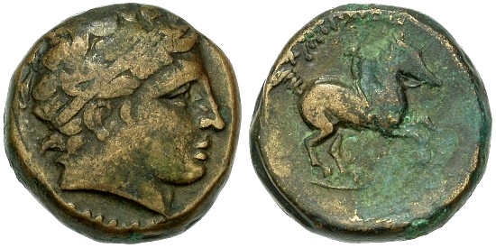 Mat suggested I give this a try, and after much enjoyment of his I figured I'd go for it This first one is one of my favorite Greek coins. I love the way it feels in my hand, the cold smooth metal, and a surprisingly heaviness for it's size. The patina (on the obv.) looks great too. I got it though, for its portrait of Apollo; I really like the way it looks. I think the lack of control mark puts some off, but I had a to get it and was happy I did. Macedonian Kingdom, Philip II, 359 - 336 B.C. Bronze AE Unit, SGCV II 6697, aVF, 7.079g, 16.9mm, 0o, Macedonian mint, obverse head of Apollo right wearing taenia; reverse FILIPPOU, young male rider on prancing horse right; "Philip II expanded the size and influence of the Macedonian Kingdom, but is perhaps best known as the father of Alexander the Great. He personally selected the design of his coins. In 356 B.C., the year Alexander the Great was born, Philip's race horse won in the Olympic Games. The reverse of this type likely depicts his winning horse." Some further info about Phillip II of Macedon (The father of Alexander The Great): http://en.wikipedia.org/wiki/Philip_II_of_Macedon