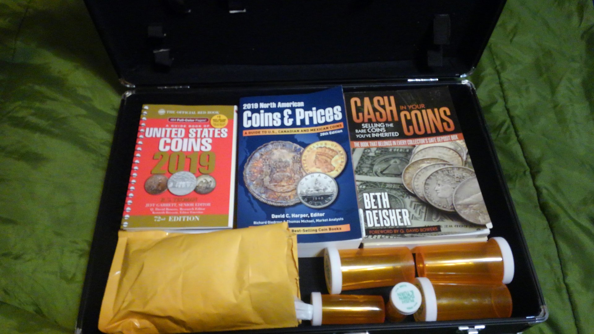 well I was thinking that I would make myself a travel case because I'm traveling to a few different states I figure I would make myself a numismatic travel case. I added a few tubes to hold coins, quite a few books for reference on hand.. the list of books are as follow 2019 North American coin prices modern world coins by Whitman coins latest version the 2019 Red Book cashing in your coins ... a few other things several different magnifying glasses including a headset or two (gloves , storage case and envelope....)will be added a few other things yes I reused medication tube for coins..lol recycling ????