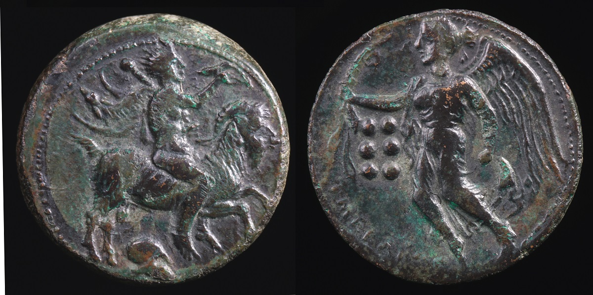 Obv: Head of Athena right, wearing crested helmet ornamented with star.