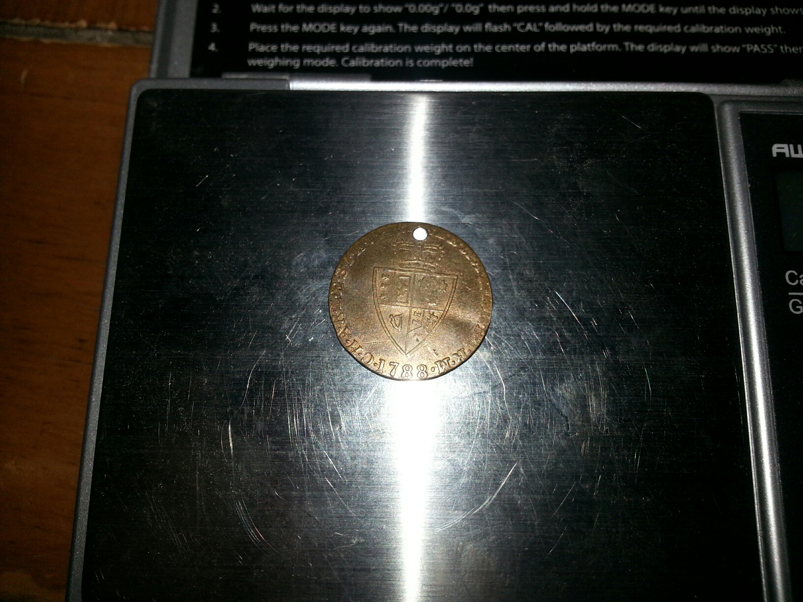 I came across what almost appears to be a 1788 George III Guinea, but it doesn't quite measure up. It's 20mm across, and it weighs ~2grams (my scale is always floating by a tenth or so). It's gold in color, but dirty and could be closer to bronze or copper. I know the Guinea is supposed to be 22kt which would lead me to believe this isn't one. But it could be? I hesitate to clean it. Any ideas?