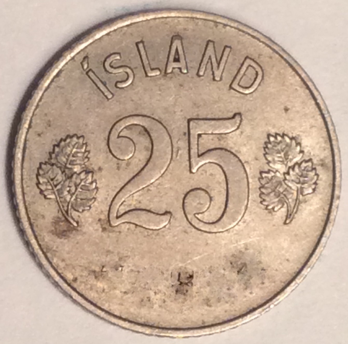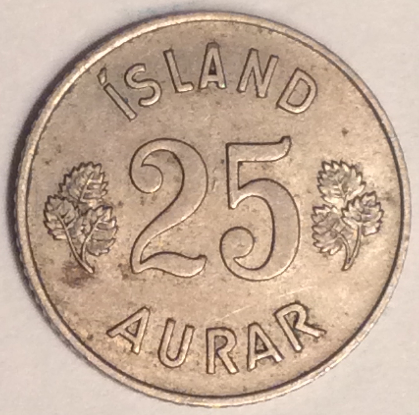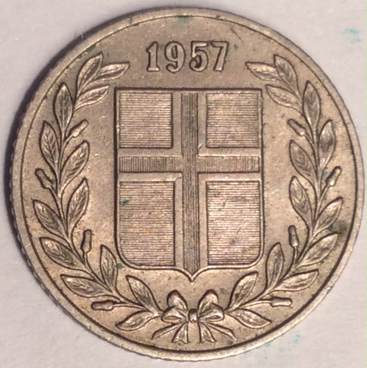 1. Iceland. 1957 2. denomination 25 Aurar 3. minted from 1946, 1951, 1954, 1957, 1958-1963, 1965-1967 4. Krause world coin catalog number KM#11 5. metal-Copper-Nickel 6. size- 16mm