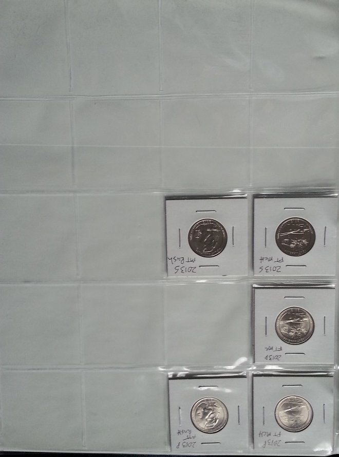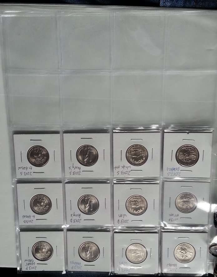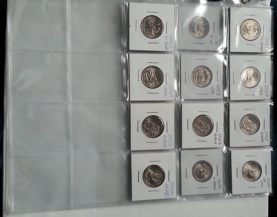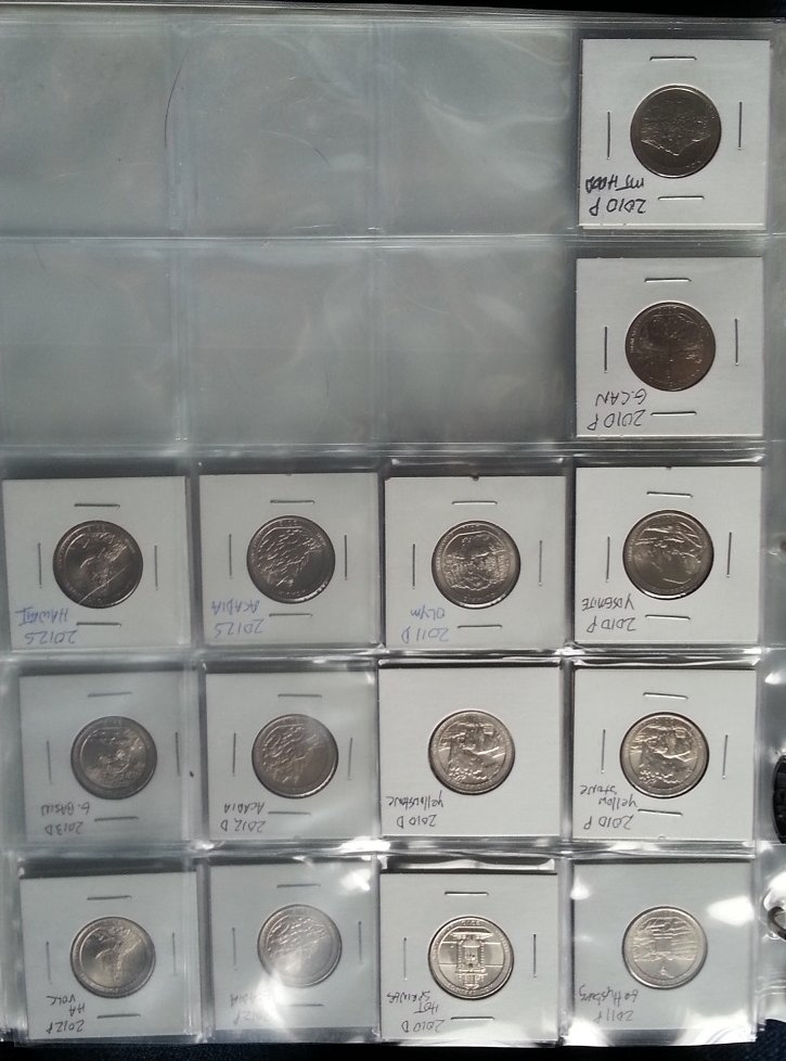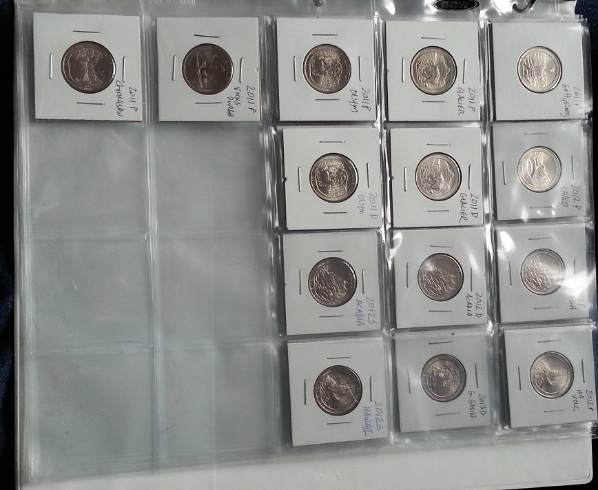 I asked the teller today at the bank for a roll of quarters. I ended up getting some National Park quarters... 2012-P Hawaii Volcanos 2012-P Alaska Denali 2012-D New Mexico Chaco Culture 2013-P Ohio Perry's Victory (already had a couple so now I have a couple extra) 2014-P Tennessee Great Smokey Mountains (already had one so now have one extra) Here is a photo update: As you can see, I still have a long way to go.