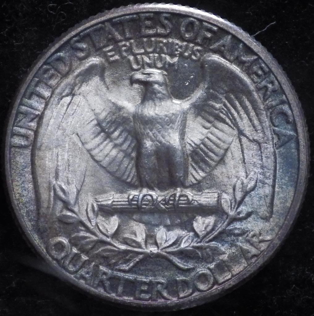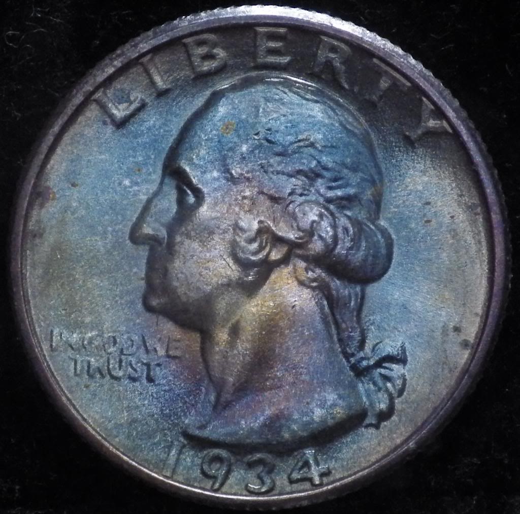 Here is a 1934 Light Motto quarter in Mint State condition. I pulled this coin, along with about 20-30 others out of an old Dansco album. All the coins exhibit some levels of toning. In your opinion is this coin natural or did someone artificially tone it.