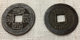 trying to identify another few ones @Stevearino From what I have learned from you guys, I guess the first one is from Japan; however, even though I found a similar one at numista: https://en.numista.com/catalogue/pieces5670.html the character at 2 o'clock on the obverse (dragon side) doesn't seem to be the same and i am unable to identify the year: and these two coins have a hole in the center, characters that I do not recognize and are shiny on one side and very dark on the other-