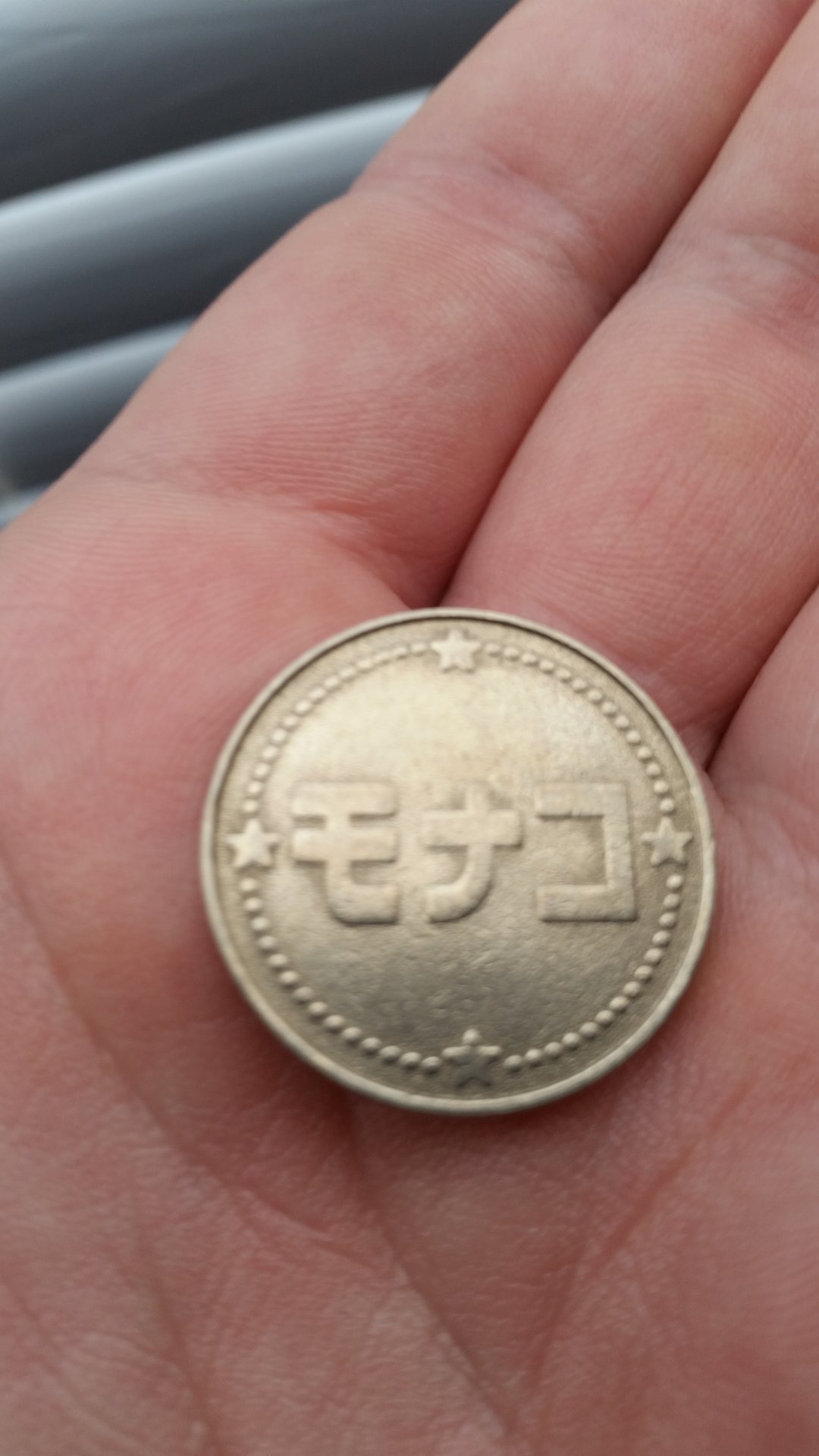 Oops, my bad, it says mo-na-ko in Japanese katakana which is used for writing foreign words (or what they consider foreign words). Might be the name of a Pachinko parlor and be a token used there.