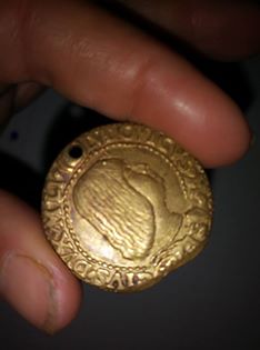 Very interesting. It is difficult to make out in the small, one-sided picture, but it appears to be a (probable replica of) a Renaissance-era gold coin; Spanish or Italian, circa 1500s. Better, full-sized pictures of both sides would help.