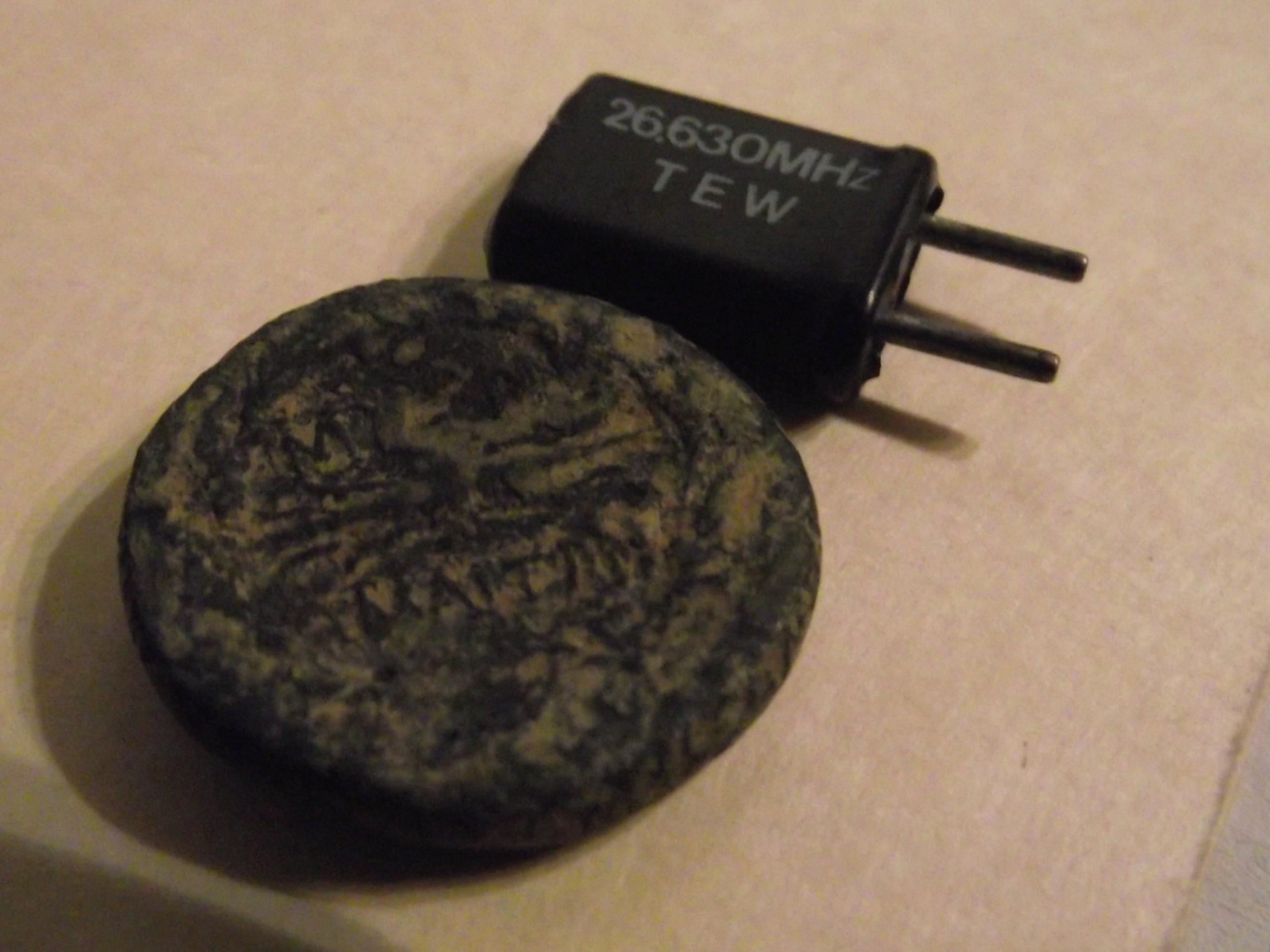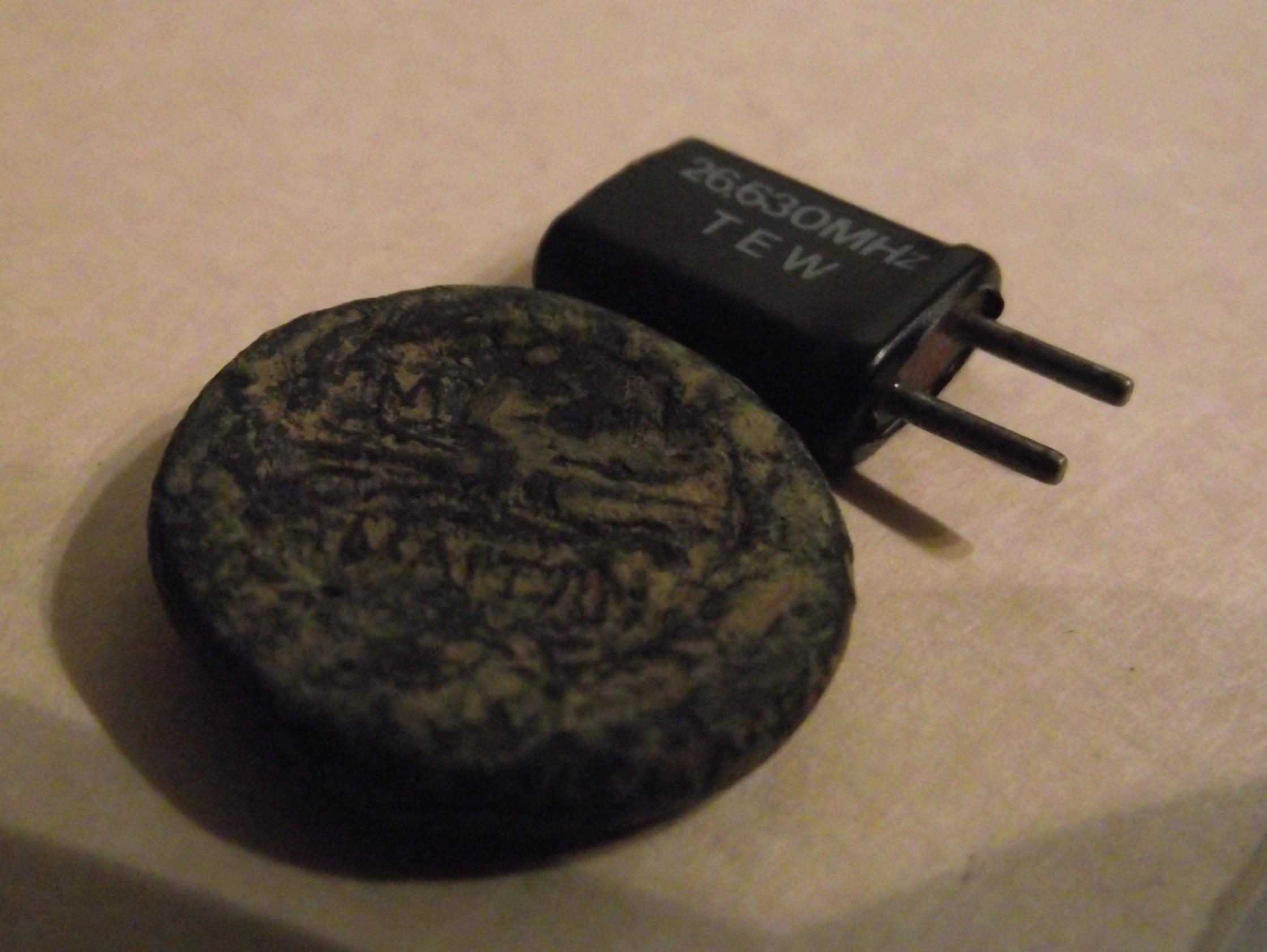 If you put a gun to my head, I would guess a Macedonian bronze, with zeus pictured in pic 2, and the other two pics of the reverse with bow and arrows in the center. The thickness is definitely Greek, possible greek imperial, but that is my guess. Try rotating the reverse so the two rows of letters are horizontal, and try to see a face on the obverse and orient it that way. Btw, how many mm is it? I don't know how big a transistor is. Chris