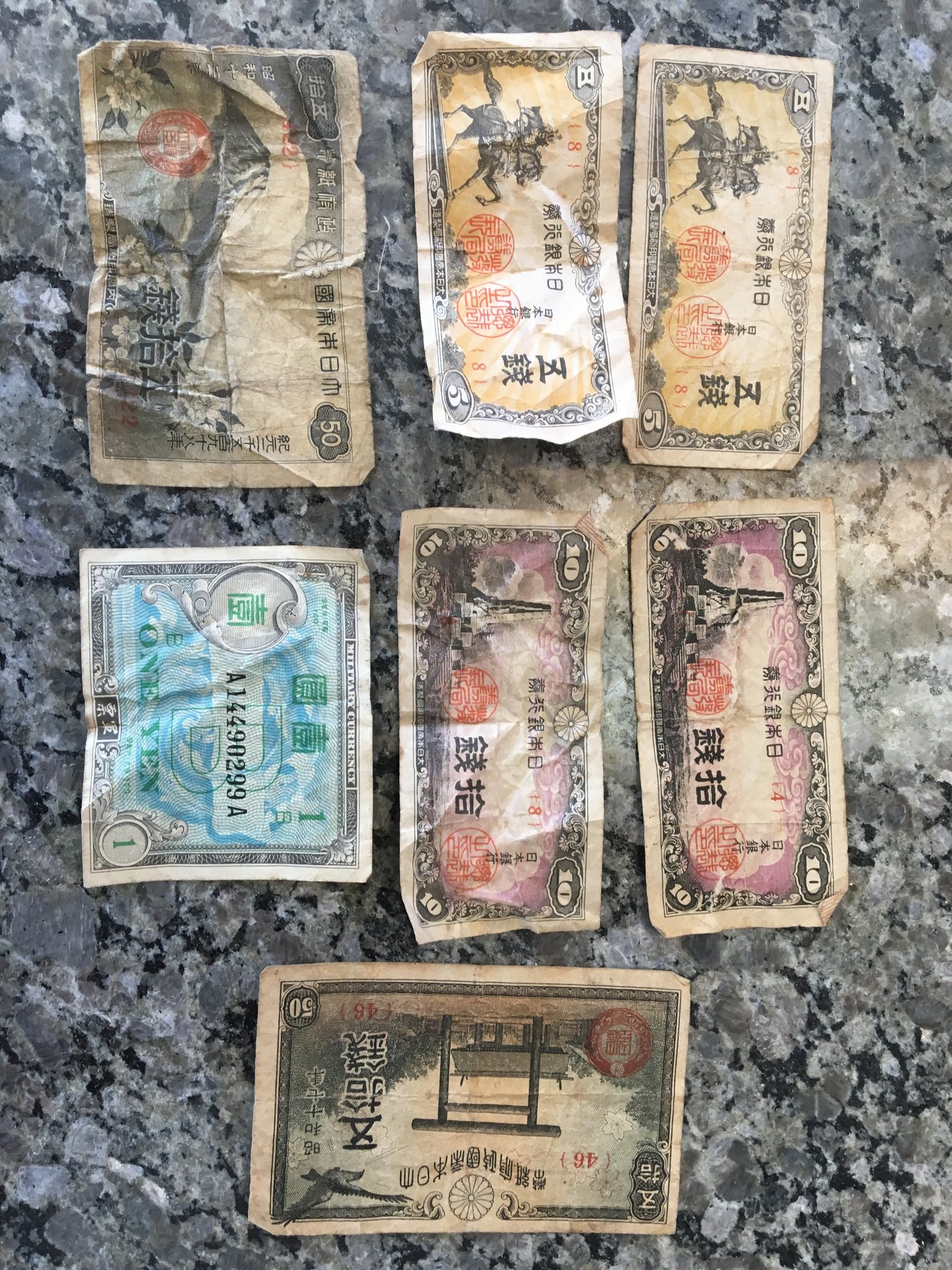 Hi, My Grandfather was in the military during WWII and stationed in Japan. He brought back the currencies pictured. Can you please give me details on them and what any of them are worth? I have no clue what I'm looking at. Is the coin a Tenpo Tsuho?