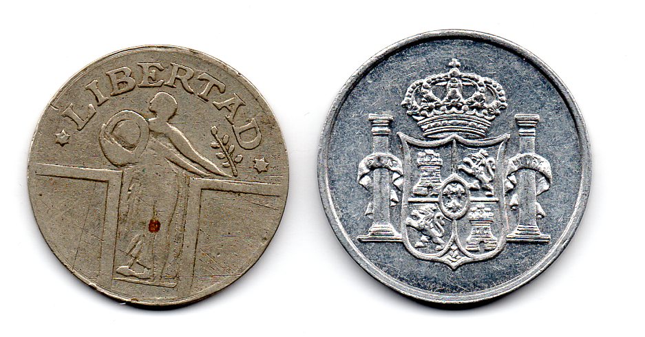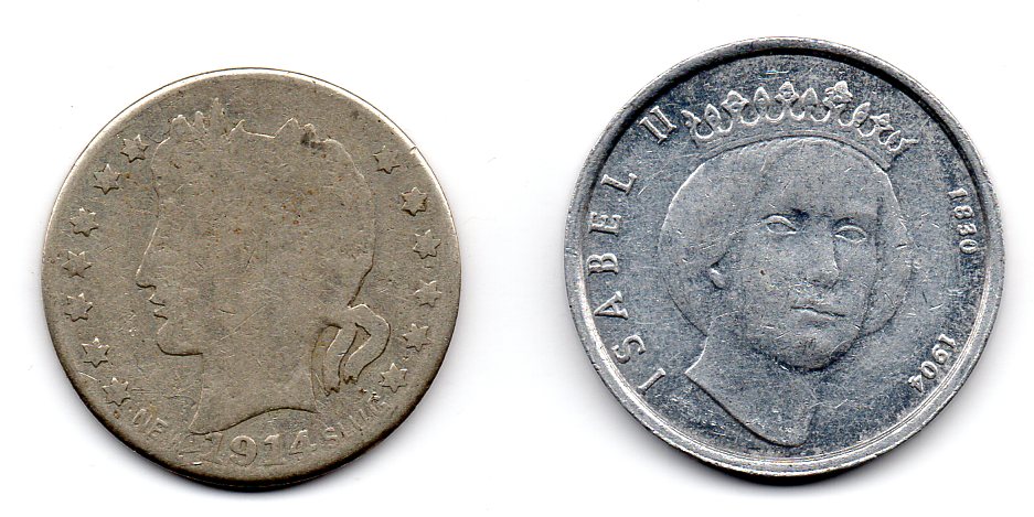 Any help would be appreciated. Coin on the Left: Country of origin: Unknown Language: English & Spanish Diameter 24.2 mm, Weight 5.2g, Thickness 1.4 mm, Metal Unknown Edge: Plain Inscription: Obv "1914 New Slug" Rev "Libertad" Coin on the Right: Country of origin: Spain? Language: Spanish Diameter 25.5 mm, Weight 2.0g, Thickness 1.9 mm, Edge: Plain Metal Aluminum Inscription: Obv "Isabel II 1830 - 1904" Rev No Script