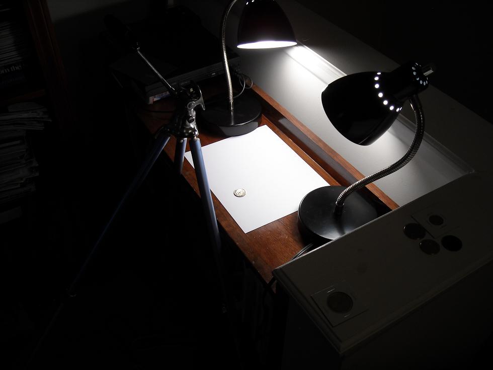 Thanks for the advice guys, I did move the lamps in a little more to increase the light, and it looks much much better now. however, there is a new problem now with the red reflection of my camera on the coins. I think I just need to make the camera angle about 4% instead of directly straight down and just stretch the pictures a fex pixels to make the coins perfectly circular. The bulbs are just regular 60W A15 soft white