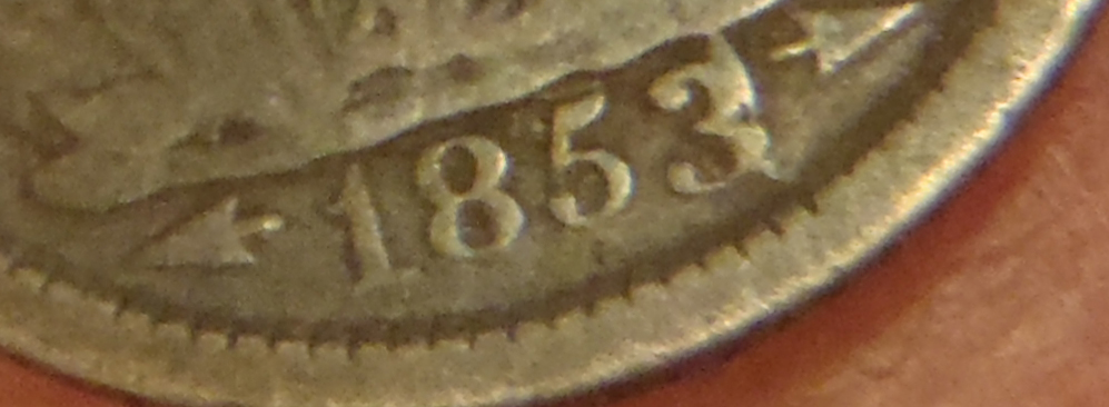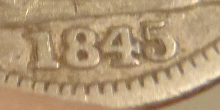 Hey guys I'm looking for some info on these two coins one is a 1845 RPD I know that but thats all I know can you give me a rarity or value. Also I would like to clean the date up it has some basic crud in the numbers but I'm afraid to hurt it. Also I have a 1853 half dime with something on the last 3 not sure what it is. Let me know what you think