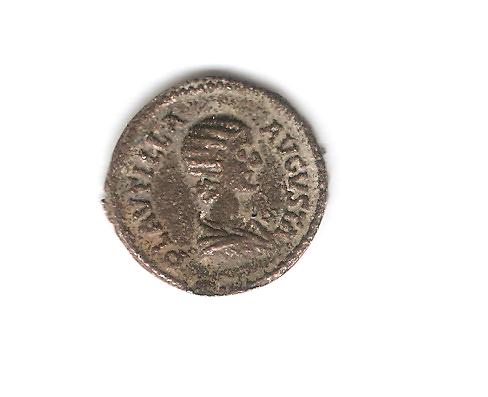 Plautilla, d. 211, wife of Caracalla. Obverse: PLAVTILLA AVGVSTA, Draped bust right. Reverse: PIETAS AVGG, Pietas standing, holding scepter and child. It has the devices and legends of a denarius, but it sure doesn't look like silver. Perhaps a contemporary counterfeit with a silver wash that's come off over the centuries.