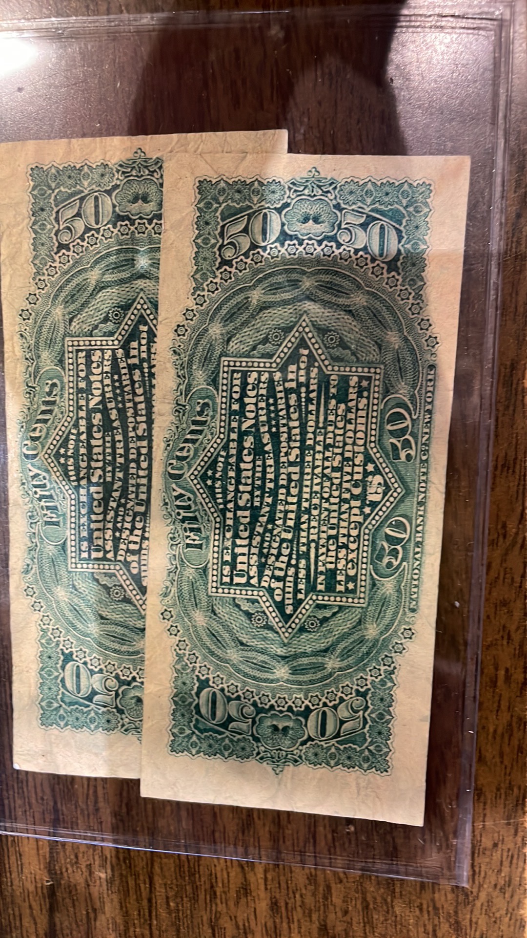 Hi everyone: I was looking through some notes and stumbled across this trio. Two look to be perfectly normal notes, FR 1374-1375, but one has two reverses. ...and before you roll your eyes and check out, understand that I work for one of the largest coin dealers in the country. Anything is possible here. Is there someone here who has a pretty deep knowledge of US fractionals? I'd just like to get some basic idea about this. TIA, Mike