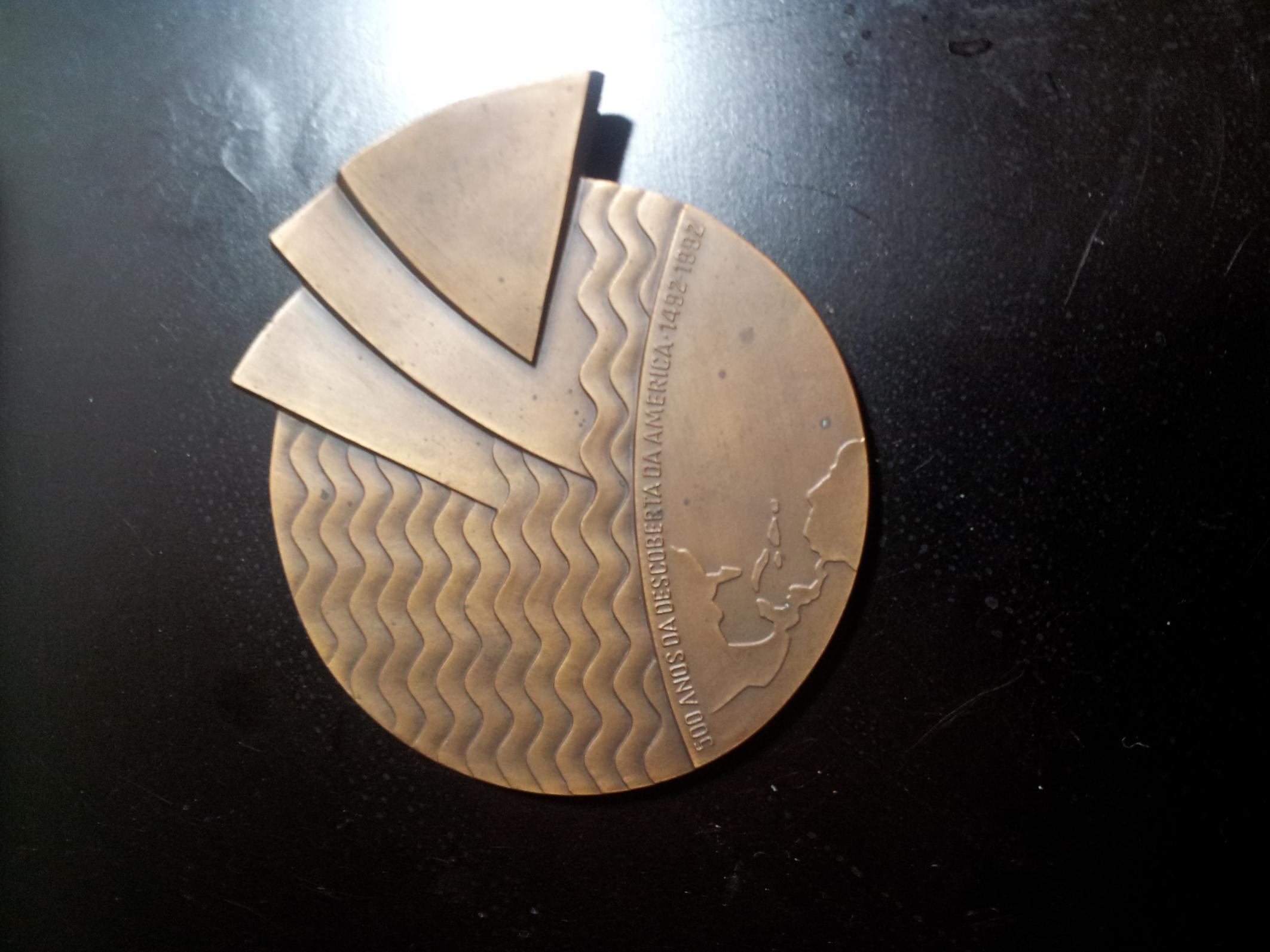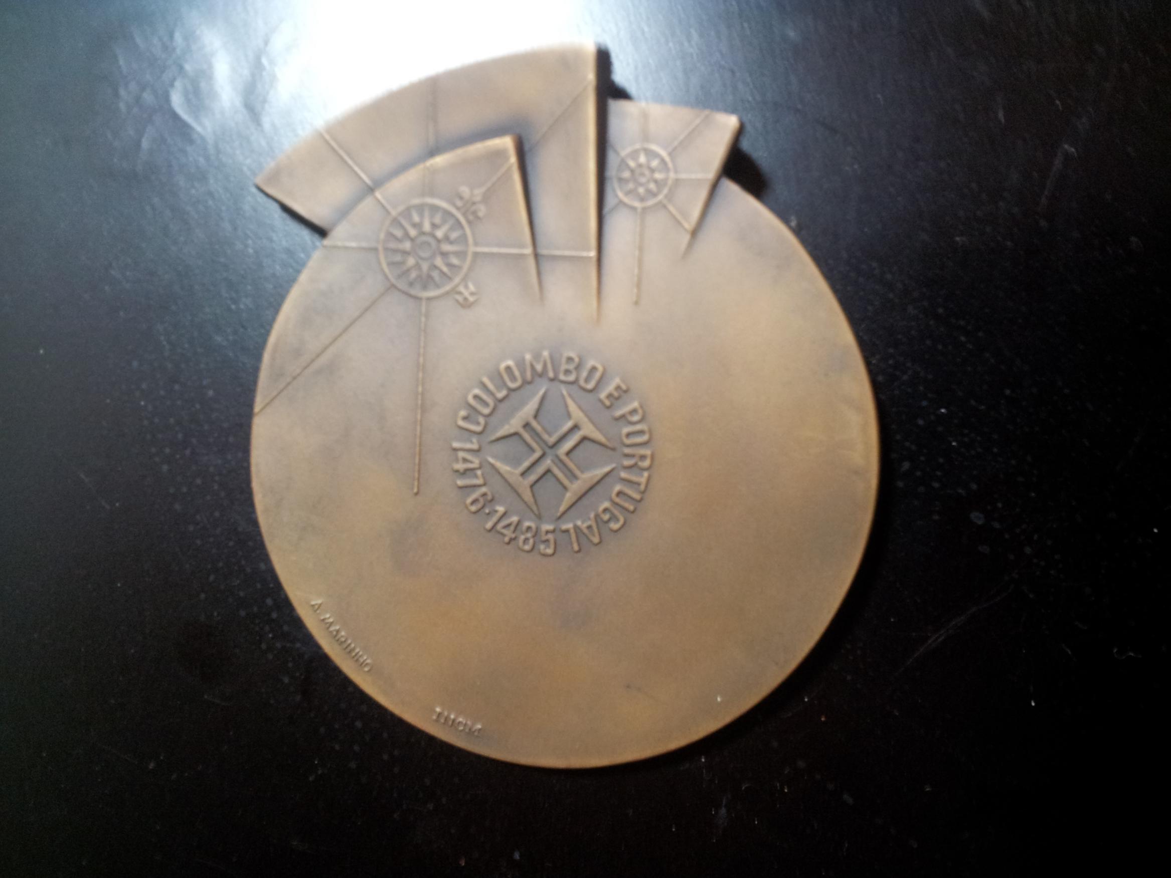 Don't know anything about the medal, but those words look suspiciously similar in English. Agreed about the serial number though. As for the design, the lower image probably shows - apart from the sea waves and the map - the sails of the three ships (Santa Maria, Niña, Pinta) if rotated 90° CW. The abbreviation INCM refers to the Portuguese mint, so the medal will have been made there. Also, the artist's name (A Marinho) refers to a designer who works for the mint, António Marinho. Christian