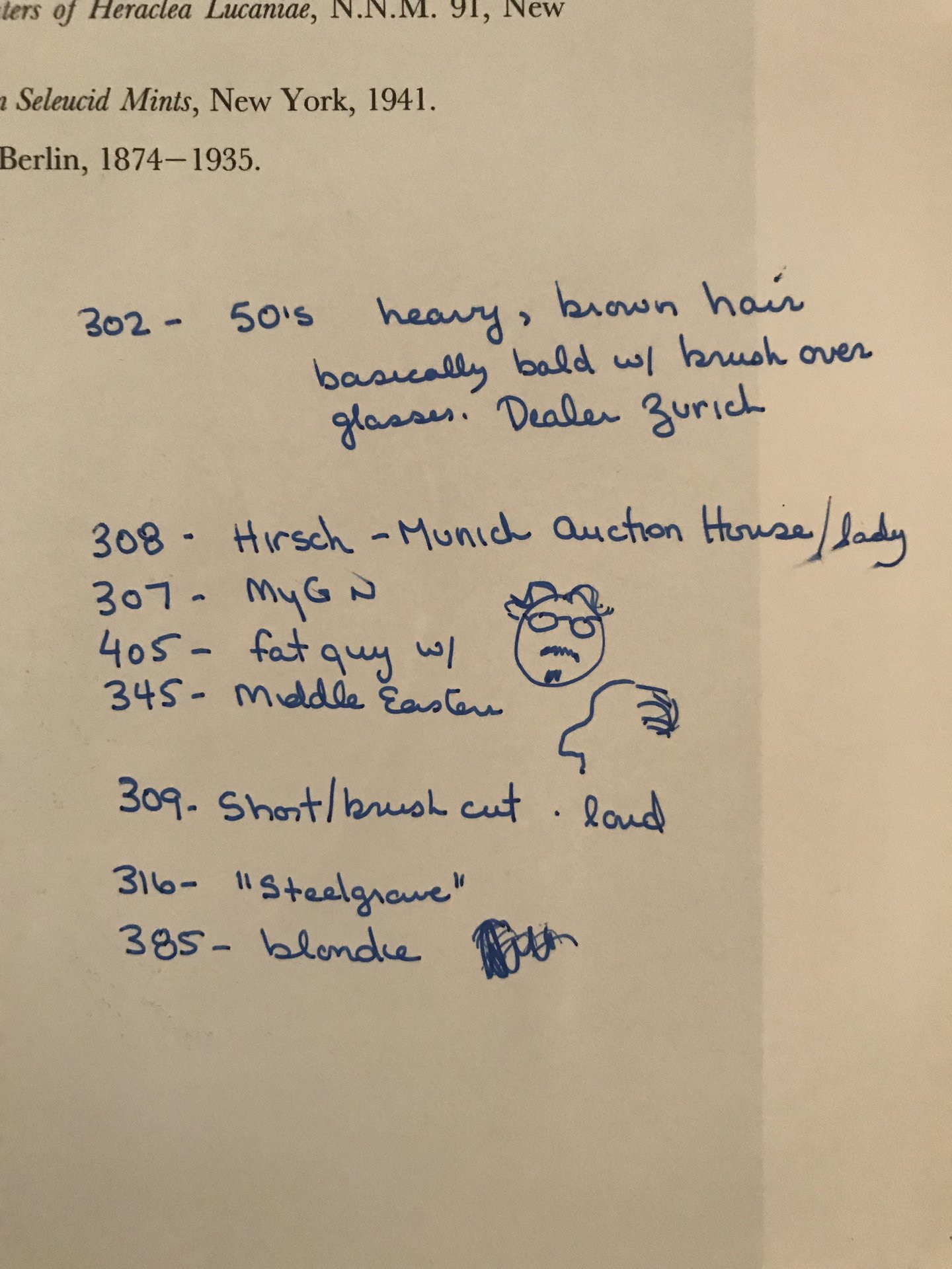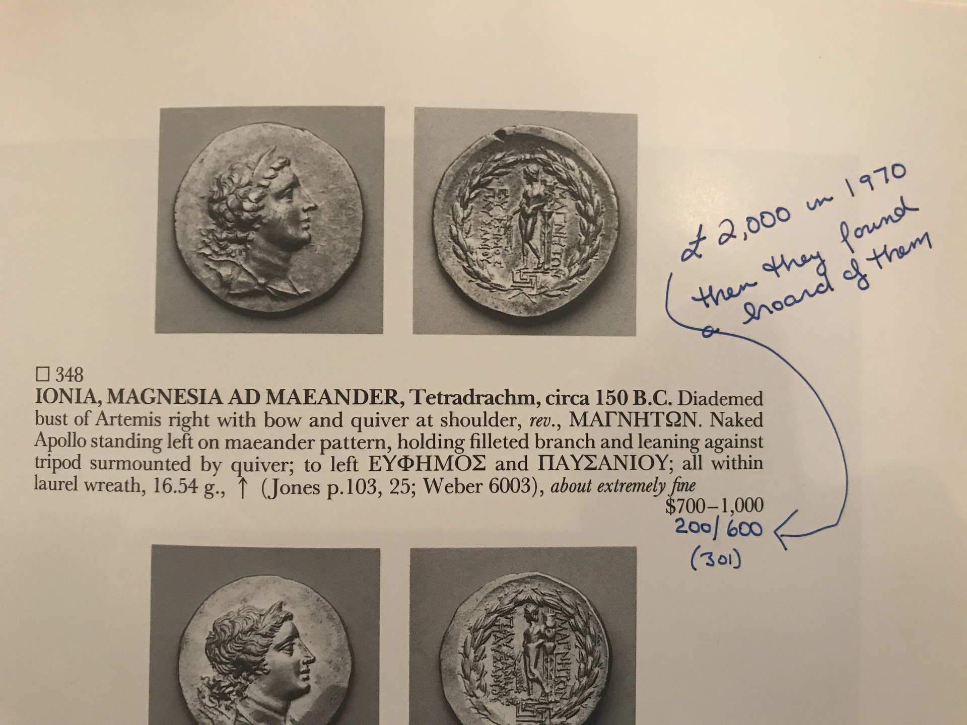 Nelson Bunker Hunt and his brother William Herbert Hunt were the 'Cleos' of the 1970s and 1980s, paying high prices for the best ancient coins on the market. They collected in slightly different areas; William collected Byzantine coins and ancient bronzes, and Nelson collected Greek and Roman coins and Greek vases. They were among the wealthiest people in the world, until they lost almost everything trying to corner the silver market. It's a stunning story of hubris and nemesis. In the early 1990s their stunning collections were sold in a series of auctions at Sotheby's. The sumptuous catalogs are good reference works, with introductions by David Sellwood and E.E. Clain-Stefanelli, but mainly they're just to drool over. It's hard to get a sense of their taste, beyond a desire for the BEST: *all* the decadrachms are here, plus the classic Greek rarities, and lots of big gold multiples. For those with a taste for antiquities, they had TWO vases by Euphronios! I've been buying the catalogs piecemeal and I've got most of them now. A couple seem to have belonged to a journalist covering the sale, judging by the notes. He even sketched some of the bidders. And noted that some coins had become less valuable following discoveries: And here is one of the highlights, a forward-facing bust of Maxentius. Anyone got any Hunt-provenanced coins?