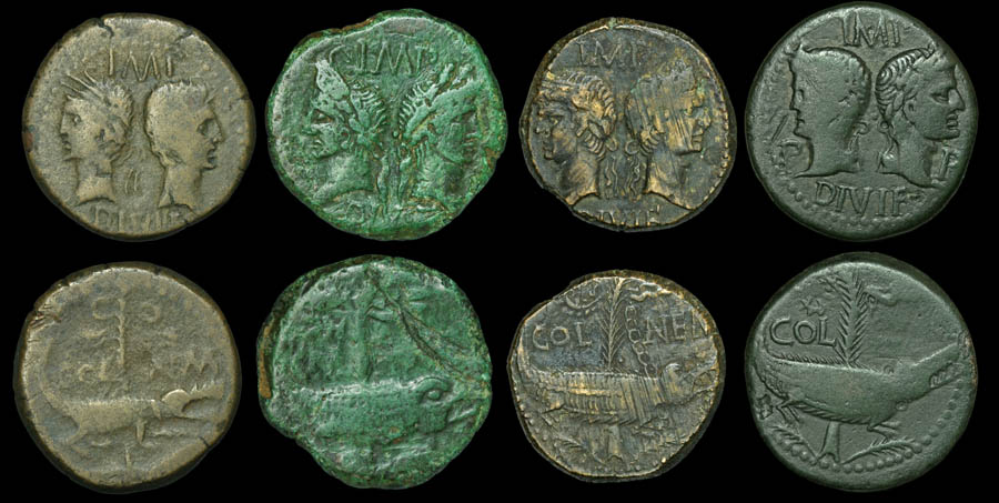 I have glanced at more than a few of these coins but am not real familiar with the Colonia Nemausus coins to the point of knowing all these variations. At present, these coins are way beyond my monthly budget, but I could save for several months and perhaps obtain one if I wished. It's difficult to say which one I'd prefer because on one coin I might like the color of one coin better than the other. On another, the obverse portraits might be less worn and have a better engraving style than another. The crocodile has nice details on the reverse, but the obverse isn't as good. Some legends are worn, etc. Although, the way it is for me. I like the color of #2 better than the rest, assuming that your photo has the color right on, compared to in-hand. I like the engraving style of #3 (from left) better than the others, but the patina looks rather thin. #4 has a solid patina and I like the Augustus portrait, as it seems less worn than Agrippa on the left side. You can find decent coins from $100 and up, now days. #1 - F+ Nice obverse, not so good reverse. #2 - VF- Nice obverse. Reverse is also detailed. #3 - VF - Perhaps overcleaned a bit but a coin with details. #4 - F+ - Nice patina and is heavily worn in places. That's my opinion and all that I can think of right now. I haven't been collecting for too long so, certainly not an expert on it.