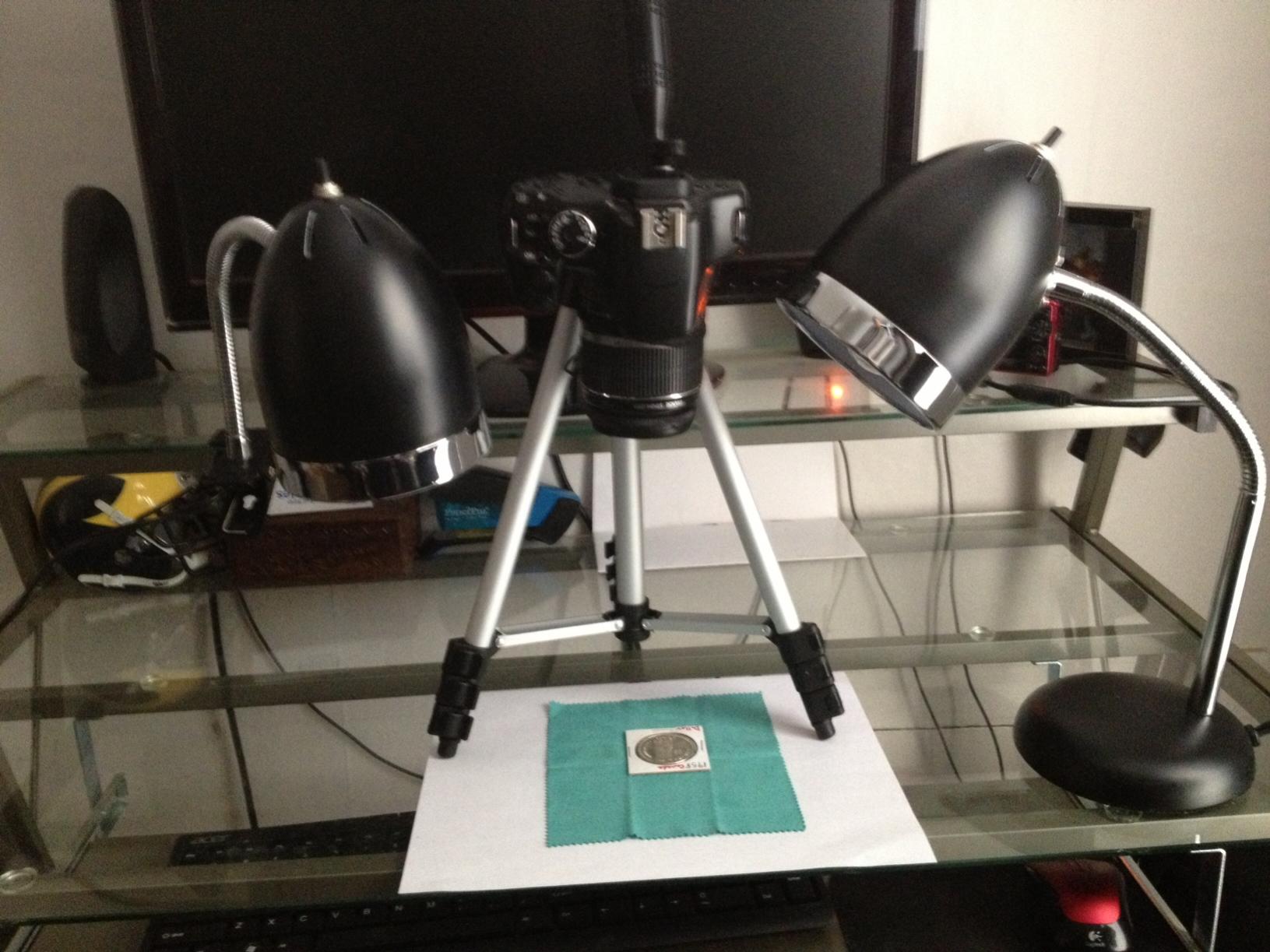 I'm using a Canon Rebel XSi but I owned the XT a few years back. The cameras are pretty similar. This is what my setup looks like. Canon XSi, 50" tripod($20) 2 desk laps($13/each) Bulbs are 43w Halogen Clear with 800 lumens. I took a picture of a similar toned end coin to show how this set up looks. I used the Macro mode to take the pictures. 2 Lights 1 Light