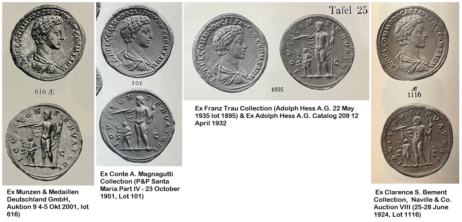 Been awhile since I was this excited about a coin! I was browsing the new inventory of a well-known dealer and saw an as of Commodus listed for sale. It was the excellent portrait which first caught my eye. I kept browsing other coins, but made a mental note to go back and take a closer look later. (dealer photo) In addition to the portrait, the coin is beautifully patinated. I also noticed that it was an interesting VOTA type, from the Jeff Clark VOTA Collection. As a collector of unusual as types, I did what I usually do when interested in a Roman coin – reach for the appropriate volume of Sear’s Roman Coins and Their Values and look it up. My eyes nearly popped out when I saw this! Is that the same coin?? I could hardly believe it! The listing did not mention anything about it being a plate coin. Could I be mistaken? I scrutinized both coin images. No question about it – it was the same coin! How on earth could a Sear plate coin lose such a provenance?? No matter, that was enough to push me over the edge! I bought the coin. Being so caught up in the excitement of discovering a plate coin, I hadn't noticed before that the rarity rating given in the dealer listing was 8/10. It's not even listed in RIC (that reference only recognizes this type as a dupondius.) There is one specimen in the British Museum collection, No. 566: coin | British Museum I did an exhaustive search on ACSearch and other archives but only found three other specimens. It was while searching Coryssa, the database created by our member @rasielsuarez that I came across this: Coryssa - The Coin Auctions Database - Coryssa - The Coin Auctions Database The same coin! Apparently, it was auctioned off by Numismatic Fine Arts on December 10, 1980. Turning to rnumis, I found the complete auction catalog. There was the coin – lot 537 – misdescribed as a dupondius, which hammered for $100 on a $200 estimate: Ancient coins. Auction IX : 10 décembre 1980 / Numismatic Fine Arts | Gallica (bnf.fr) How did this coin end up being illustrated in RCV? Thanks to a CT thread by our valued member @Curtis I learned that David Sear was a cataloguer for a number of NFA auctions, and used some of the coins in his RCV reference books. Check out the thread and Curtis's awesome Philip I plate coin here: https://www.cointalk.com/threads/finding-provenance.403741/page-2 So to make a long story short, I am now the proud owner of a Sear plate coin – which also happens to be an extremely rare type, has a terrific portrait, a beautiful patina, and an interesting collection provenance. Doesn’t get much better than that! Feel free to comment/post your own surprise plate coins, provenance discoveries, Commodus coins, or anything else! COMMODUS, AD 180-192AE As (24.84mm, 7.59g, 11h) Struck AD 185. Rome mint Obverse: M COMM ANTON AVG PIVS BRIT, laureate head of Commodus right Reverse: VOT SVSC DEC P M TR P X IMP VII, Commodus, togate, standing left, sacrificing over tripod-altar; COS IIII P P in exergue, S C across fields References: RIC - , BMC 566, RCV 5897 (this coin illustrated) An extremely rare type, with a fine portrait and rich emerald patina. This coin is the illustrated plate coin in David R. Sear's popular reference series Roman Coins and Their Values (Vol. II, p. 411) From the Jeff Clark VOTA Collection.