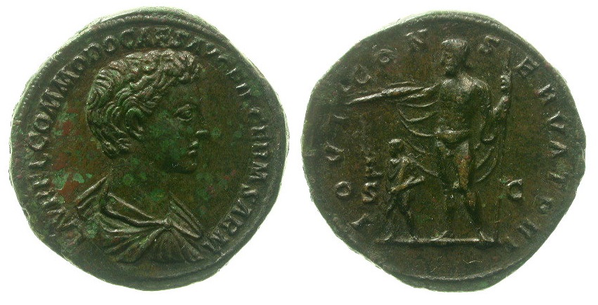 Very nice,., here is my sestertius version.. COMMODUS AUGUSTUS AE sestertius. 184–185 AD. M COMMODVS ANTO—N AVG PIVS BRIT, laureate head of Commodus right. Reverse - VOTA SVSCEP DECEN P M TR P X IMP VII COS IIII P P, emperor, veiled and togate, sacrificing left from patera over tripod, S—C across field. RIC 454a. Cohen 990. BMCRE 564 variant (ANTONINVS in obverse legend). 33mm, 24.4g.