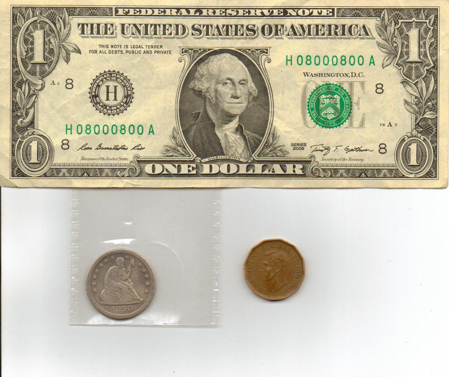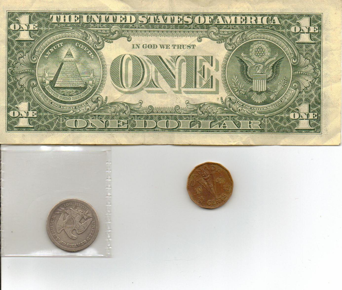 the US $1 is one that i found in my lunch money, and i figured you guys would enjoy pictures, the 1850-O is from PFCBEGA's contest, and the 1943 Tombec canadian victory nickel is from Moneyer, thanks guys!