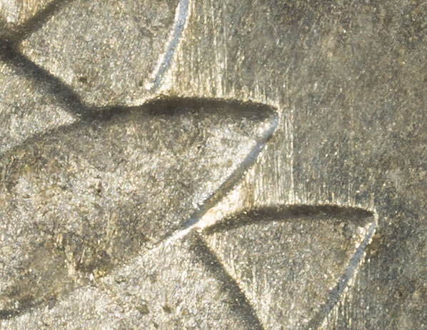 I've been shooting coin photos off my tripod for a couple years, but recently picked up a new toy, a copy stand from Ray (rmpsrpms here on CT). It's going to be quite the setup I think, though I've only shot half a dozen coins on it at this point. He provided everything but the camera in this case, including the stand, camera adapter, bellows, lens, rail system, micrometer-adjustable base stand and lights. The $700 cost probably isn't for everyone, but for me it was worth it as I was pricing and figuring out how to build this kind of setup anyway. A huge advantage for me is being able to set this right on the desk next to me, instead of the bulky tripod setup I had. And the little focusing stand is really fantastic, I recommend that highly. Here's a 100% crop of a section about 2mm square. Dave ... oops sorry about all these attached files. They're not different, just me not being able to attach things correctly