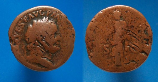 Came in the mail yesterday. It has a nice portrait and patina. Allot of the legend is gone but I think the attribution it correct. Domitian AE As. 85 AD. IIMP CAES DOMIT AVG GERM COS XI CENS PER PP, laureate bust right, wearing aegis / SALVTI AVGVSTI above and below facade of the altar-enclosure of the Ara Salutis Augusti with detailed double-paneled door & horns above, S-C across fields. C. 419, RIC 304b, RIC 2 418 ?