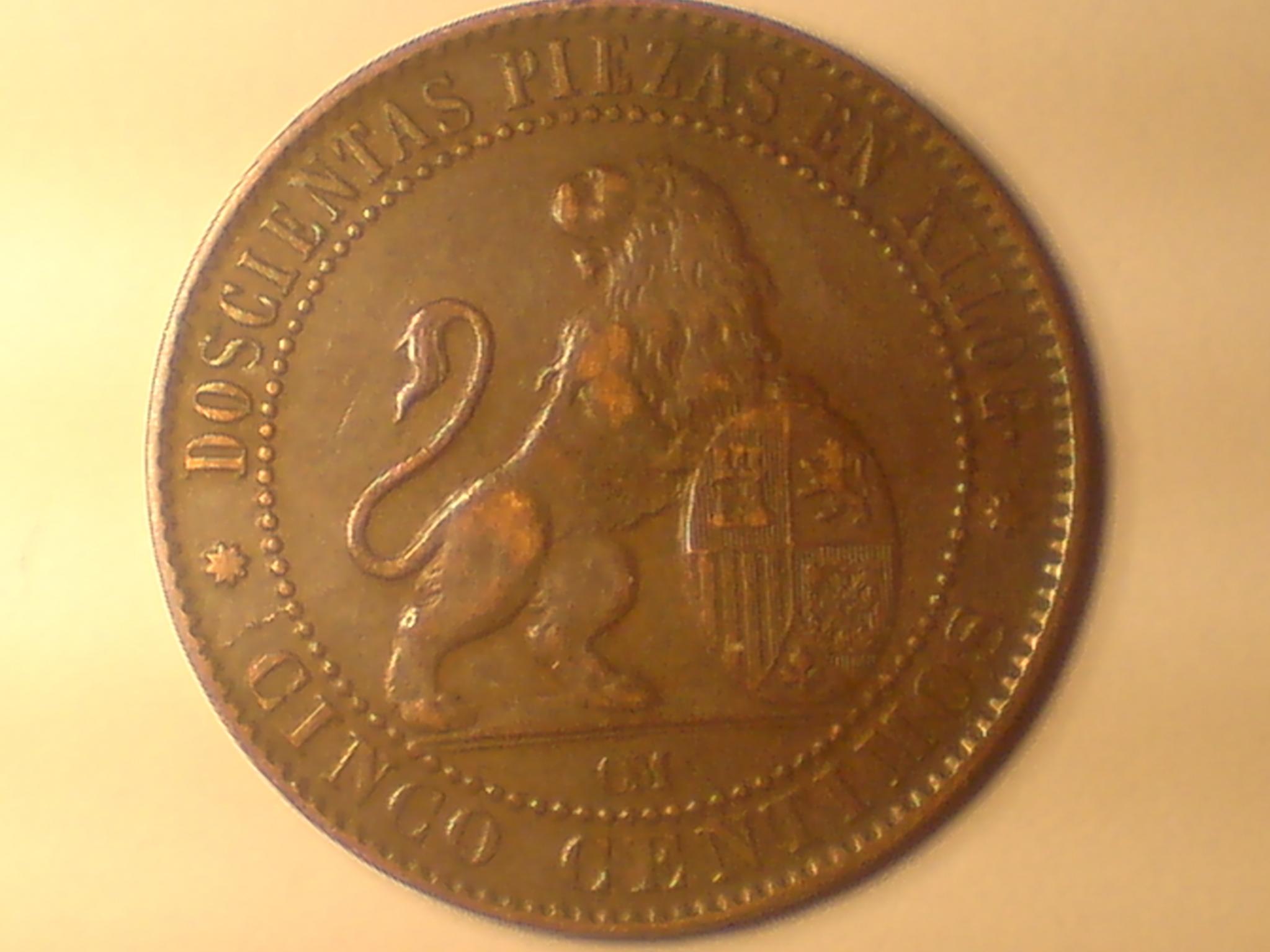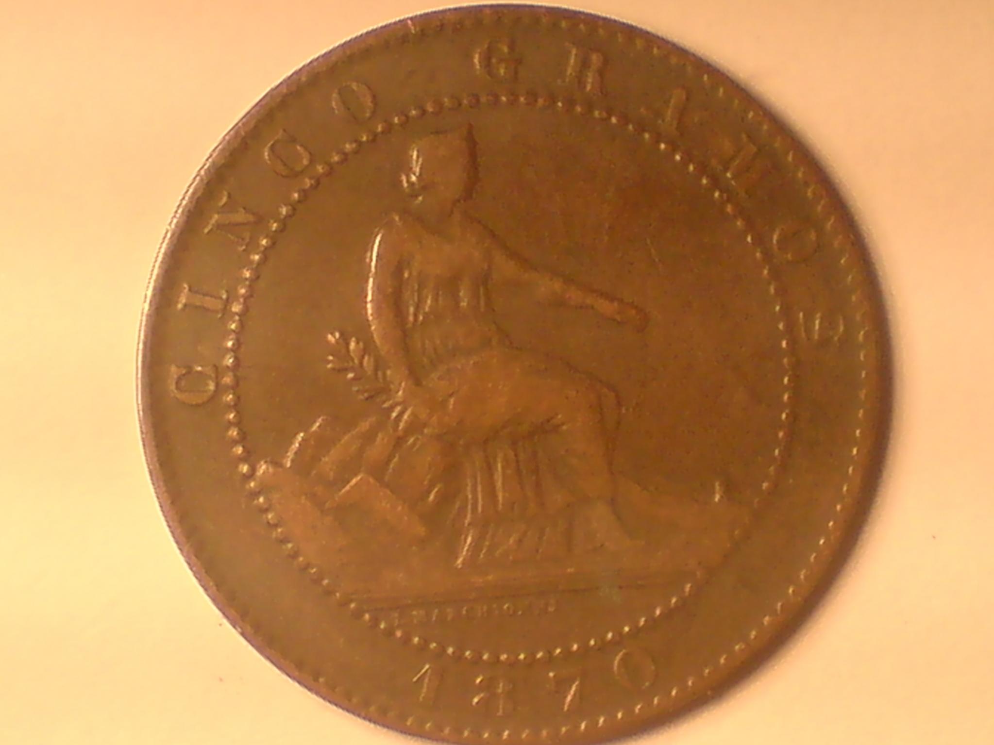 go these today and love them both. the spanish coin is a 5 cinco 1870 and i have never seen one in this high a grade. as always opinions very much welcome. sorry for the bad pic. for some reason i have a real hard time photoing copper
