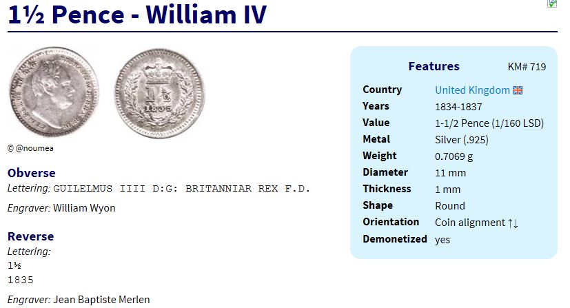 The origin was a period of forty years on and off of a chronic shortage of small change. The half threepence was a logical step down from the sixpence, half a shilling. Of course, the fact that it was silver meant the size was miniscule and it was no real answer to the coinage problem. The 20 years from about 1790 to 1810 were a period when there was virtually no state coinage of farthings to pennies worth mentioning, hence the vast range of token coinage. Many efforts were made to establish a new coinage because a copper coin worth a penny in copper was very large and heavy and the famous cartwheel twopence was absurd. The idea of making a copper penny worth a penny in metal was slowly abandoned, but the idea that the currency should be worth money in itself hung on in some quarters leading to a silver coin that was worth its weight in silver. As is usual with government projects this arrived 15 or 20 years after it would have done any good. Many of the coins were packed off to the colonies where tiny amounts of money were involved in deals, to join the fractional farthings in obscurity. This was also the period of the silver groat or 4 pence, a coin so easily confused with the silver threepence that any random assortment of silver threepences today is likely to contain the odd groat that has slipped in unnoticed.