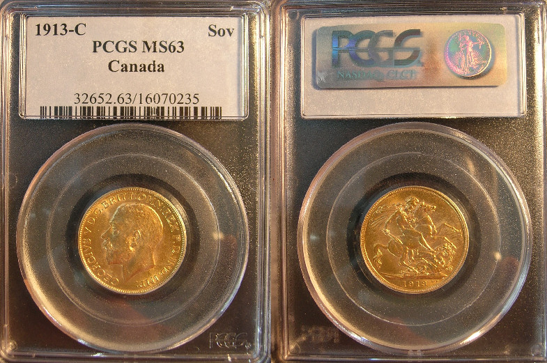 Wanted to show off my new prize, a 1913-C Canadian sovereign (Ottawa Mint), certified MS63 PCGS. The 1913-C has a low mintage of 3,717 pieces, second in rarity among business strike Canadian sovereigns (the 1908-C is a specimen issue) only behind the legendary 1916-C sovereign. Michael A. Marsh gives the 1913-C an R4 rarity rating, "15-25 known." While we have no idea how accurate that grade is, it is a safe bet that the PCGS population is swollen by resubmissions. Enjoy! :hail: George