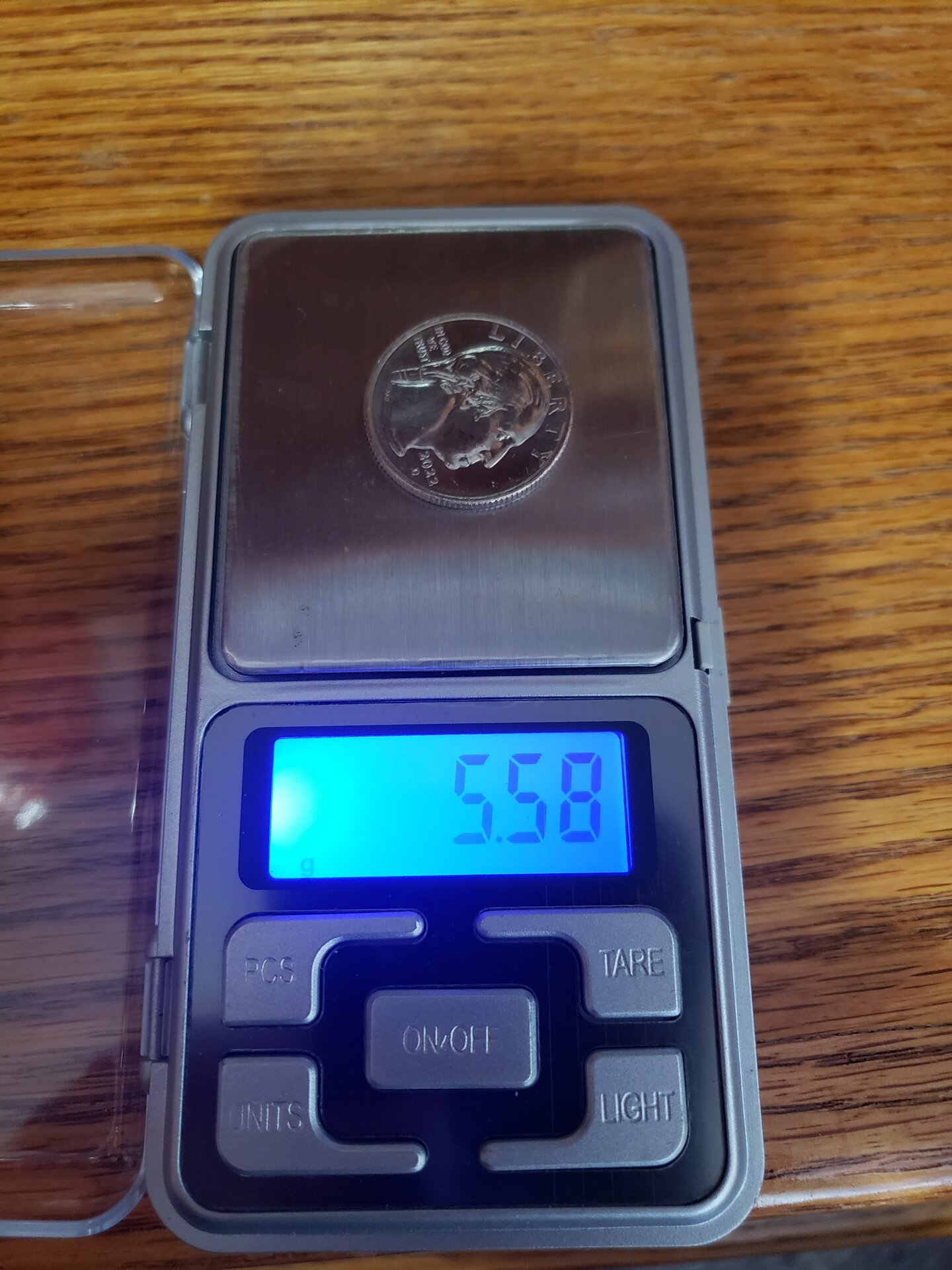 Here is mine: Both I got weigh the same. A regular qtr I weigh with the scale is around the 5.7 mark.